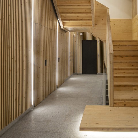 The thermal envelope is given by a ventilated granite façade and, for thermal control, the elimination of thermal bridges has been rigorously verified. All the materials used have made it possible to design a building that minimizes consumption for its operation and has an harmful impact on the environment.