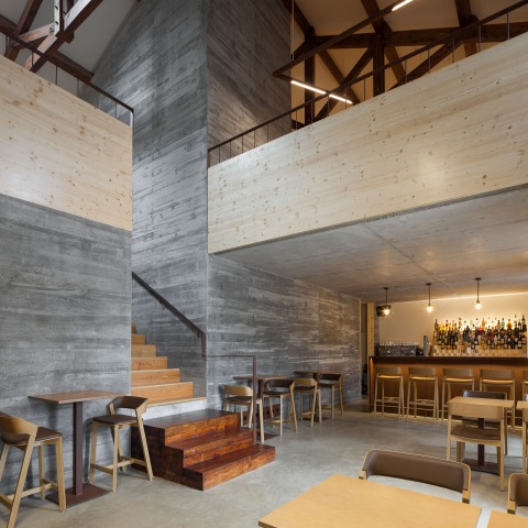 Throughout the space, the solid rock and concrete textures and colours are balanced by the warm elements in wood beeing them the existing roof structure or the furniture, designed to create scenic moments as the cellars.
