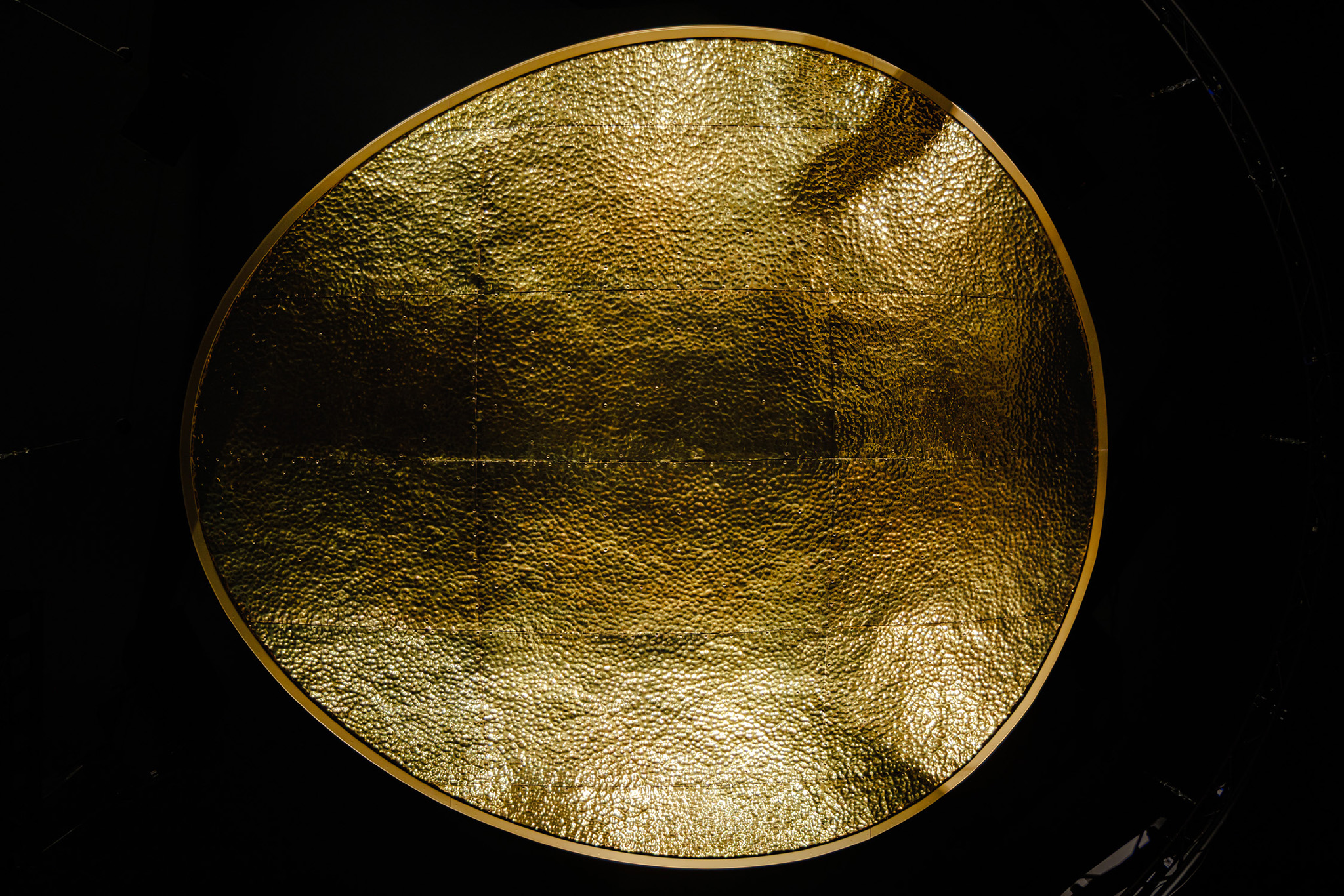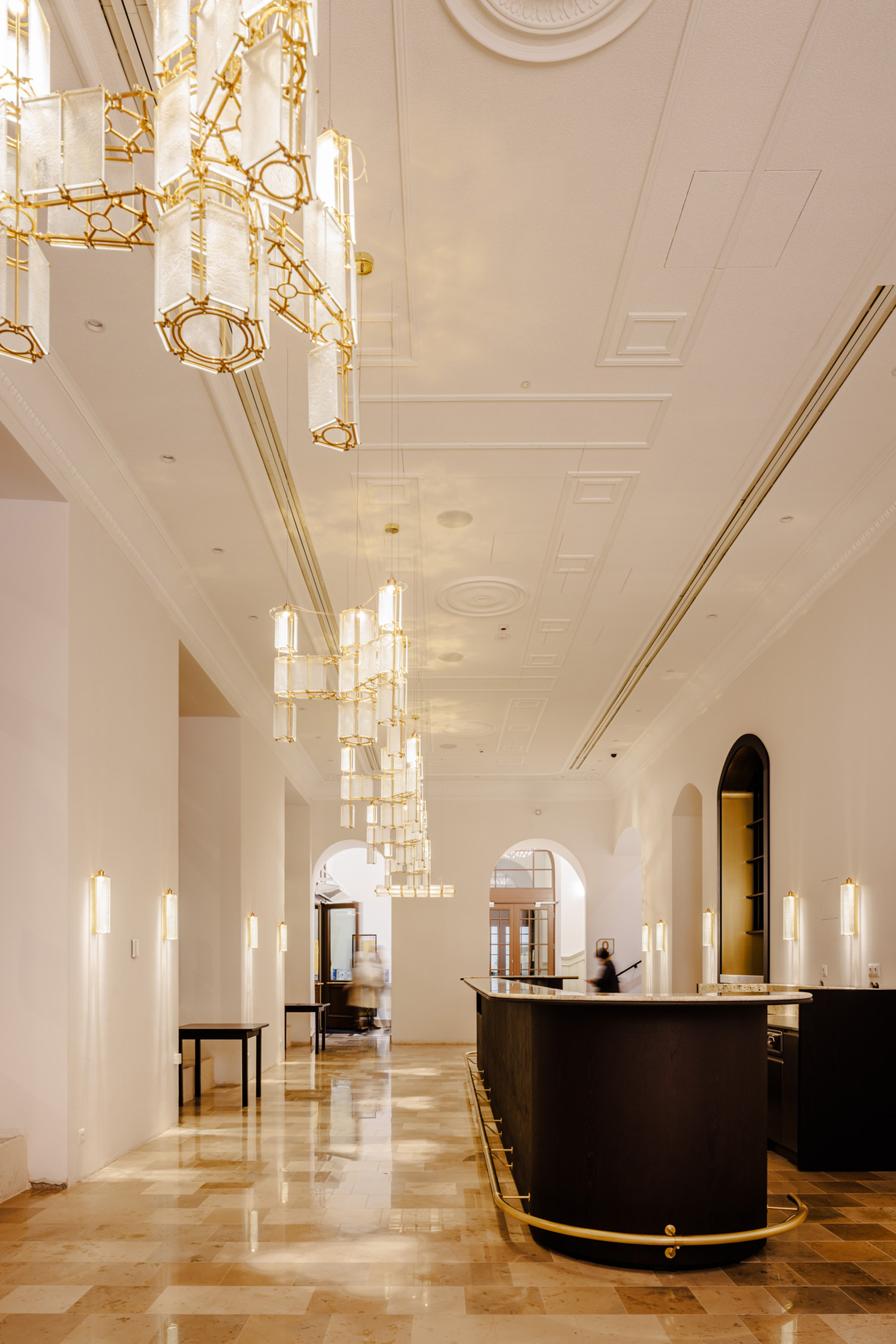 A striking contemporary accent is the hand-hammered, gilded brass ceiling feature above the Main Stage, serving both decorative and acoustic functions. The applied colour palette – gold, pastel pink, and light and dark greens – draws inspiration from the original fin-de-siècle interior design of the Żeromski Theatre.