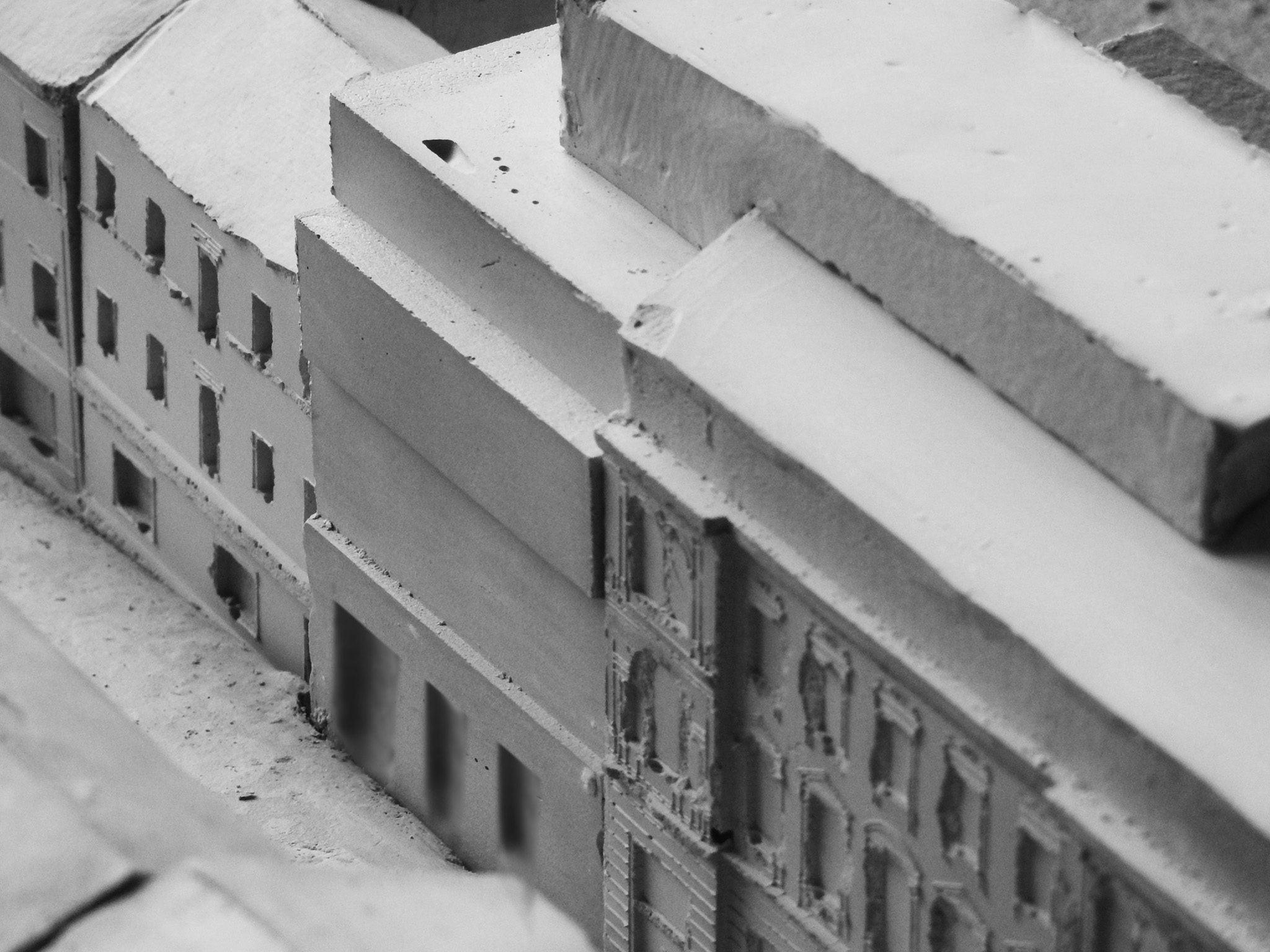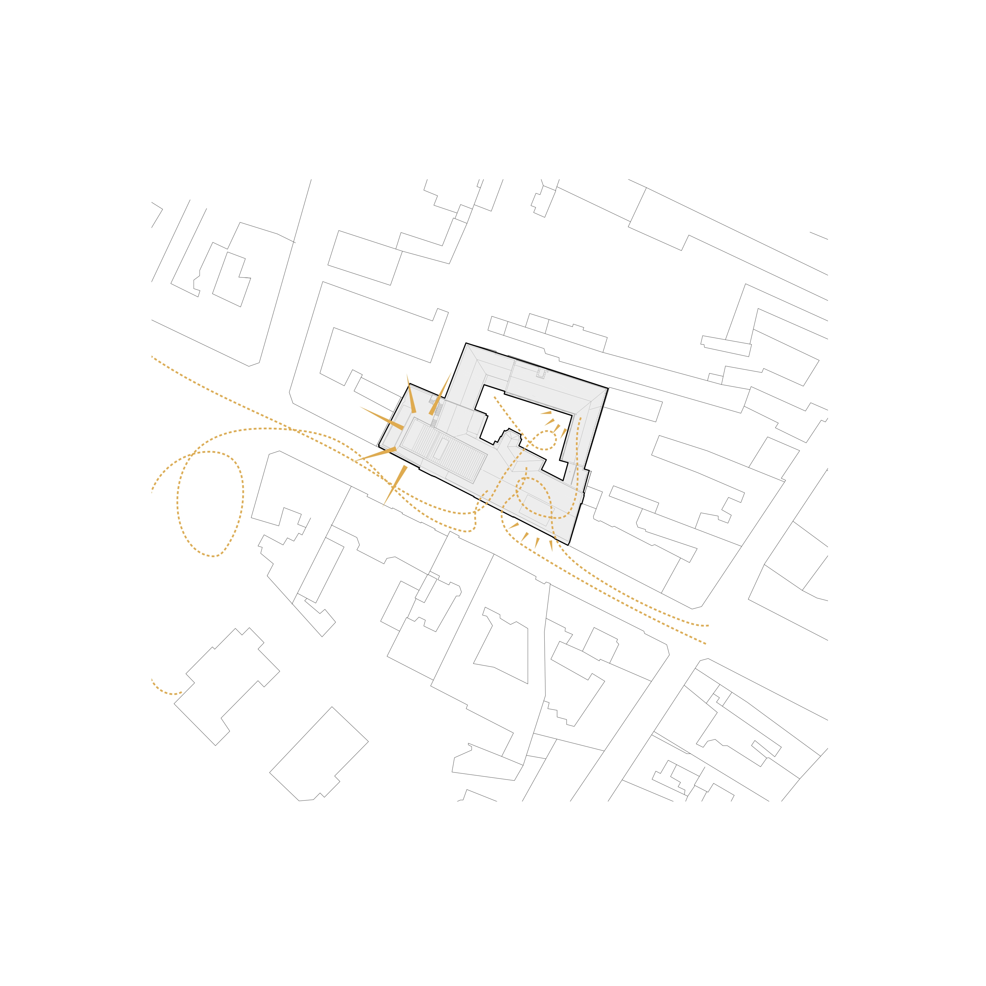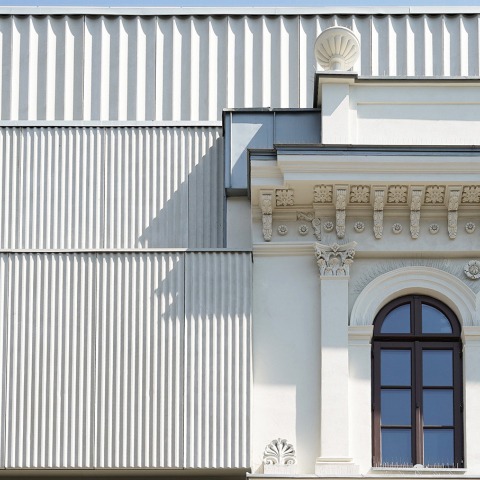 The new volume was designed in a contemporary, restrained architectural language sensitive to its historical surroundings. The connection between “old and new” was conceived not through imitation or contrast, but through dialogue—where the modern part builds continuity without losing its own identity. The façade of the new structure, clad in fluted concrete panels, continues the rhythm and scale of the historic frontage. The new courtyard wings correspond with the classical architecture through their proportions and the composition of window openings.