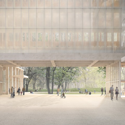 The building uses a slender construction, which rises above a concrete base. The structure remains visible through the building’s fully glazed façade creating an intriguing sense of depth. Two public squares give structure to the extensive site, designed to resemble the clearings in the adjacent park. The urban, street-side square acts as a representative entrance area, while the planted square adjacent to the park features circumferential seating and can be used for various activities and events. A covered outdoor space under the elongated building, links the squares and allows a flowing transition through the property.