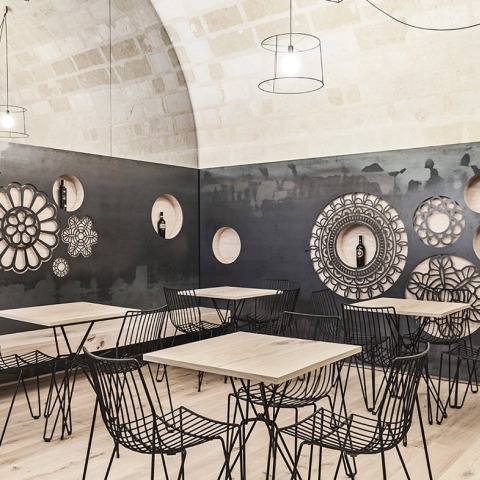 However, what characterizes the project is the treatment of the surfaces of the walls which is entrusted with the task of reinterpreting the message conveyed by tradition; large rosettes, obtained from engraving plates in iron, recall the working of lace and tuff and thanks to a double wooden skin become containers and displays for hand made products, offered for sale by the owners. The atmosphere is warm and welcoming thanks to the use of light oak wood, used for flooring, for covering the counter and the tables; and it is embellished with a seemingly random succession of large lanterns contemporary. Only two materials, metal and wood to bring out the original structure in tuff left visible in the vault and emerging here and there on the walls.