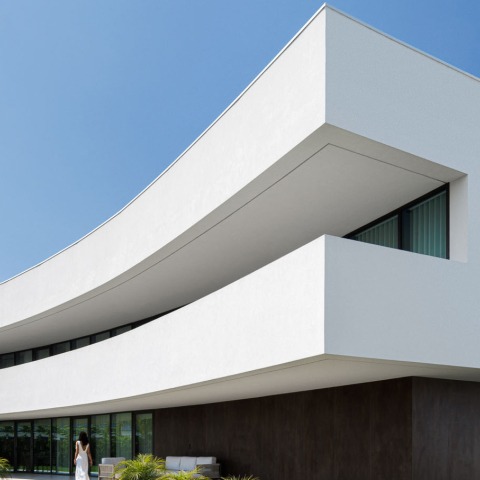 This horizontal facade, just as the plan sets out, allows the upper body of the house to rise and stand out, through the retreat of the ground limits, composed by Corten coloured walls that, together with big windows, are distinguished from the unavoidable white body of the upper part of the building, in a game where structural balance and materiality mix together to lighten up a volume with great dimensions.
