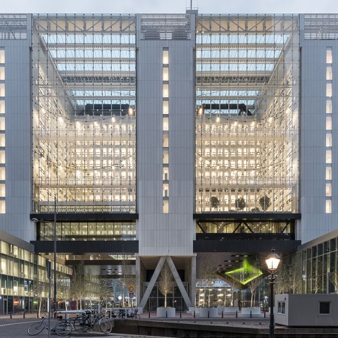 Partner architect of OMA, Ellen van Loon led the transformation project, designing a building that accommodates flexible ways of working which require less office space. The transformation of Rijnstraat 8 is the first large-scale implementation of the Dutch government's new real estate strategy which aims to reduce the real estate owned by the government. The involvement of the private sector is encouraged both in designing, building and financing governmental office space, and maintaining and operating the building’s energy supply, for which it is responsible for the duration of 25 years. Various sustainability measures, such as the application of triple glass in the atria, the use of solar panels, LED lights and implementation of a heat and cold storage, result in a significantly reduced energy consumption. The use of new materials has been minimized: of the 20% of the building that was demolished, 99.7% has been reused.