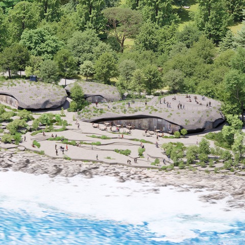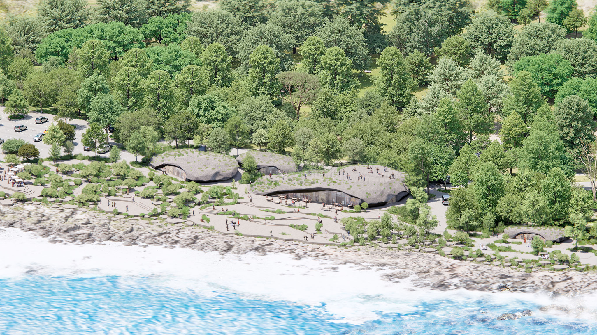 MVRDV’s masterplan replaces and improves the old infrastructure while enhancing the park’s natural identity. All new construction will be confined to areas that are already developed to avoid disrupting the original natural landscape. Inspired by the layered forms of the coastline, the design breaks up the existing straight road and reimagines recreational pathways as a cracked, rocky, naturalistic landscape that stitches the forest and the coastline back together. The rock-like fragments define various zones for circulation and public activities while some are extruded into buildings that echo the natural features of the local rock formations, blending into the surrounding environment.