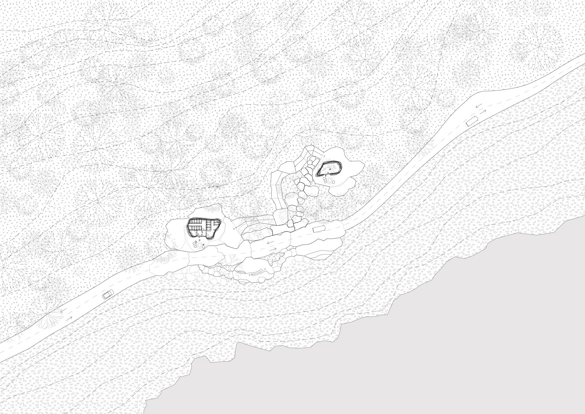 For the rest of the route, the existing road will be transformed into a more accessible route for pedestrians, cyclists, and shuttle buses, as well as clear zones for movement and relaxation. Several smaller “stops” are positioned at existing points of interest: the stone viewing deck, a sea lookout point, and the waterfall. At each stop, the site's existing outdated structures are replaced with viewpoints, kiosks, and other facilities.