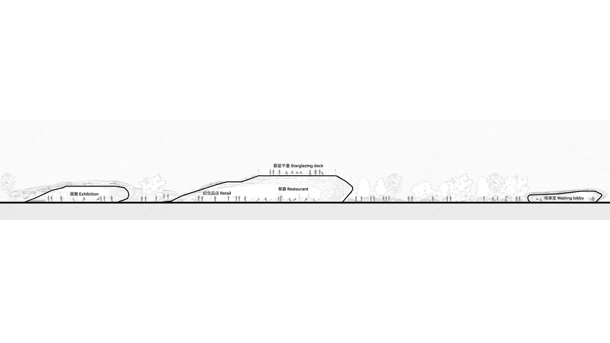 At the entrance to the park, three sculptural buildings form a welcoming cluster. The largest of these “rocks” houses the welcome centre, a café, and a souvenir shop. A second building provides spaces for exhibitions and environmental education, while the third contains restrooms. The main building’s roof doubles as a terrace for stargazing and panoramic views. This entrance cluster is set within a sloping landscape of small plateaus and plazas designed for events, markets, or simply to enjoy the view.