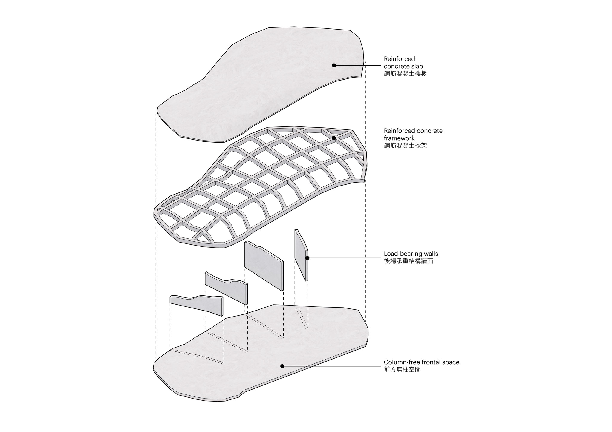 Resilience and regeneration are central to the Jialeshui Rocks transformation. To help manage stormwater and reduce damage from typhoons and flooding, cracks in the pavement are introduced as passive drainage and protective buffers. These cracks also support biodiversity, allowing greenery to take root and creating passages for small animals to cross between forest and shoreline. A gradient planting strategy is adopted, using natural forest formations as a framework. Tall and dense native vegetation is clustered near the forest, gradually shifting to salt-tolerant, low-growing species closer to the sea. Even the building surfaces themselves will, over time, be colonised by moss and small plants that take root in the concrete – the only material suited to the site’s harsh conditions, which will recycle a percentage of its aggregate from demolished buildings.