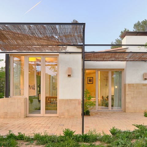 Trees provide essential summer shade and create a small forest-like area for shelter. They also block direct views from outside and help the house blend into the rural landscape. The fence, conceived as another natural boundary like those found in the surrounding landscape, is made from native, drought-tolerant species. A mix of shrubs avoids the look of a uniform screen, forming instead a green base that further filters views from the street and provides a backdrop when seen from the house.