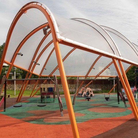 The project answers to the requirement of a covered area in the park of Ugarkalde. A roof able to host activity all year round, despite of the weather conditions. The proposed canopy involves adding a new element to an existing park, complementing this way the other recreational areas of this urban space. The new structure is situated over one of the two playground areas -the biggest- reaching a surface up to 170sqm.