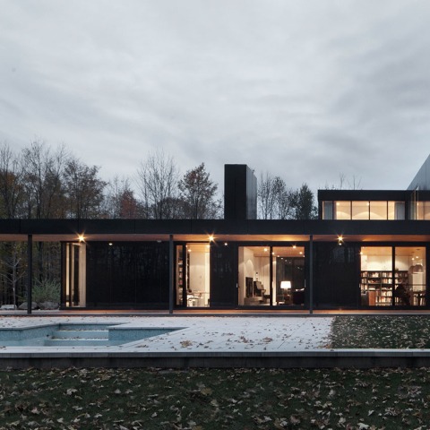 Les architectes FABG, best known for their practice in the field of institutional architecture and for the restoration of a Mies Van der Rohes' gas station in Canada, have designed this detached house in a wooded area on the outskirts of the town of Sutton, Canada. The two-story house is organized in two volumes perpendicular to each other, seeking the division of use and the minimal noise transmission between floors due to the different lifestyles of the users. The two volumes are open to the natural environment, offering panoramic views from the bedrooms and commmon areas.