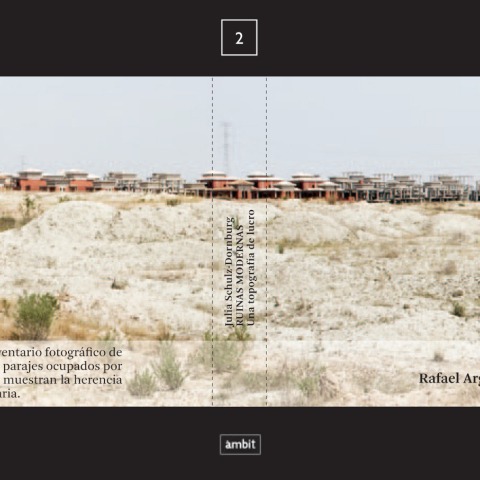 "Ruinas modernas, una topografía de lucro" is a photographic inventory of speculative construction in Spain, showing areas of land occupied by abandoned construction projects, the legacy of the burst real estate bubble. In recent years, the embedding in Spanish territory of massive leisure enclaves and all kinds of tourist and residential complexes has transformed huge zones of the country, not only along the coast but also in the interior. The premature decline of many of these projects is presented through images of disturbing beauty, bearing witness to the short life of real estate speculation and its enduring physical scars.