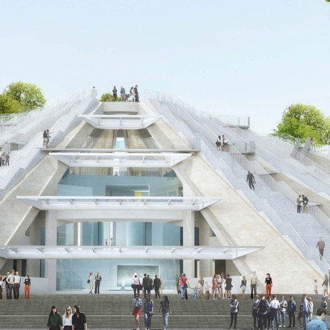 The transformation of the Pyramid shows how a building can be made suitable for a new era, while at the same time preserving its complex history, and demonstrates that historic brutalist buildings are ideal for reuse. The project also meets a number of the Sustainable Development Goals outlined by the United Nations. Rather than wastefully demolish the structure, its robust concrete shell is adapted along circular economy principles. This principle is further developed in the design of the exterior steps, which use the stone tiles that originally adorned the façade as aggregate in the new concrete.