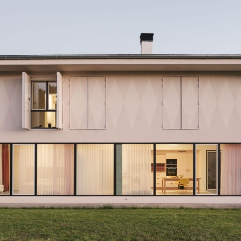 The project thus chooses not to get involved in urbanized environments that soften its surroundings, accepting and emphasizing the abrupt position of the house, lying on the side of the road, between orchards and pastures. The distant image is completed with a compositional exercise on the façade that exalts the ornament. First, as a denial of a modernity understood as globalizing simplicity and second as a vindication of identity, of popular and artisan pride of the decorative. From here, two complementary views are built, one directly on the ground floor as a direct and gross extension of the environment and another slow, controlled and furtive that from the upper floor allows to fly over the environment and search for the horizon. After that, the exercise focuses on a double interpretation of domestic life.