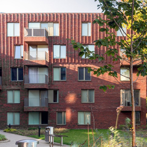 The area around Leaf Street in Hulme, just outside Manchester city centre, has a history of urban renewal. The typical Victorian terraced houses were demolished after World War II to make room for the infamous Hulme Crescents, the largest social housing project in the United Kingdom at the time. In the 1990s, the ‘Crescents’ were demolished, and a large part of the neighbourhood redeveloped. Hulme Living on Leaf Street is a fourth-generation urban renewal housing development that combines apartments and single-family homes in one building mass.