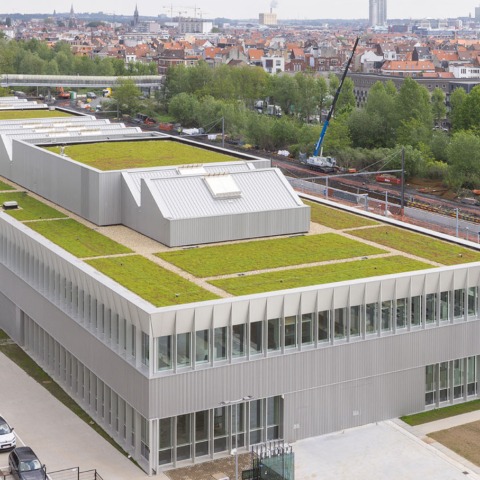 The homogeneity of the slatted façade is only interrupted by the passageway, reinforced on both sides by vitrine-like fixed glazing that clearly marks the main entrance. The closed parts of the façade are clad with corrugated sheet metal. The sheeting is finely ribbed and thus matches the shading slats. Ventilation grilles are subtly integrated into the corrugated sheeting by local perforations. The building lettering "Infrabel Academy" is achieved in a similar way and combined with backlighting, making it stand out strongly in the dark. The roof, which is easily visible from the surrounding taller buildings, is designed as a fifth facade. For this reason, the necessary technical spaces are designed at the same time as the sheds of the atriums. This creates a large attic, highly varied and rhythmic in its volume. The sheds create a uniform, almost workshop-like light as well as a reference to the industrial character of the area and the railway site. The flat part of the roof is greened and gives the building a soft and natural appearance.