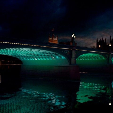 Across the Golden Jubilee Footbridges, a monochromatic scheme will complement the walkways designed by Lifschutz Davidson Sandilands in 2002, mirroring Villareal’s approach to the other pedestrian bridge in the artwork – Millennium (illuminated July 2019). Westminster and Lambeth Bridges bookend the UNESCO World Heritage Site of the Palace of Westminster. Westminster Bridge’s latticework undercrofts will be illuminated in soft green tones referencing the benches of the debating chamber of the House of Commons.