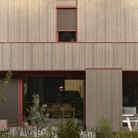 The structure of the homes is resolved with a system of prefabricated timber-framed walls. Half of the houses are in shades of gray wood with red metal trim, while the other half are in black wood with green metal trim, completing the composition and reinterpreting the local color palette, while striving to maintain a certain unity throughout the development.
