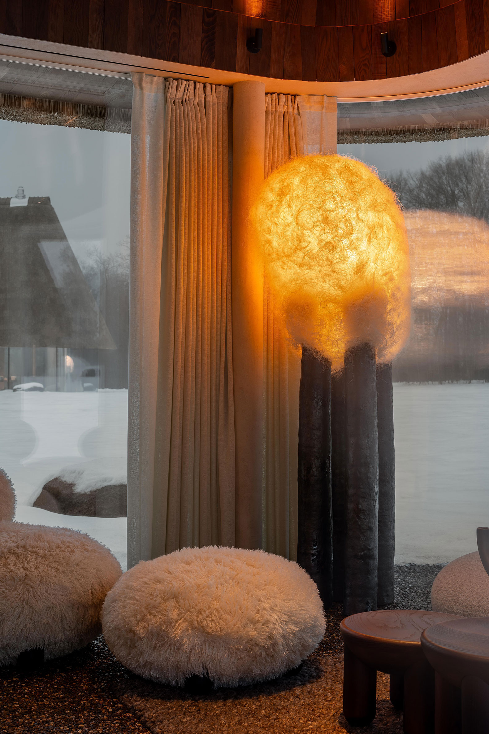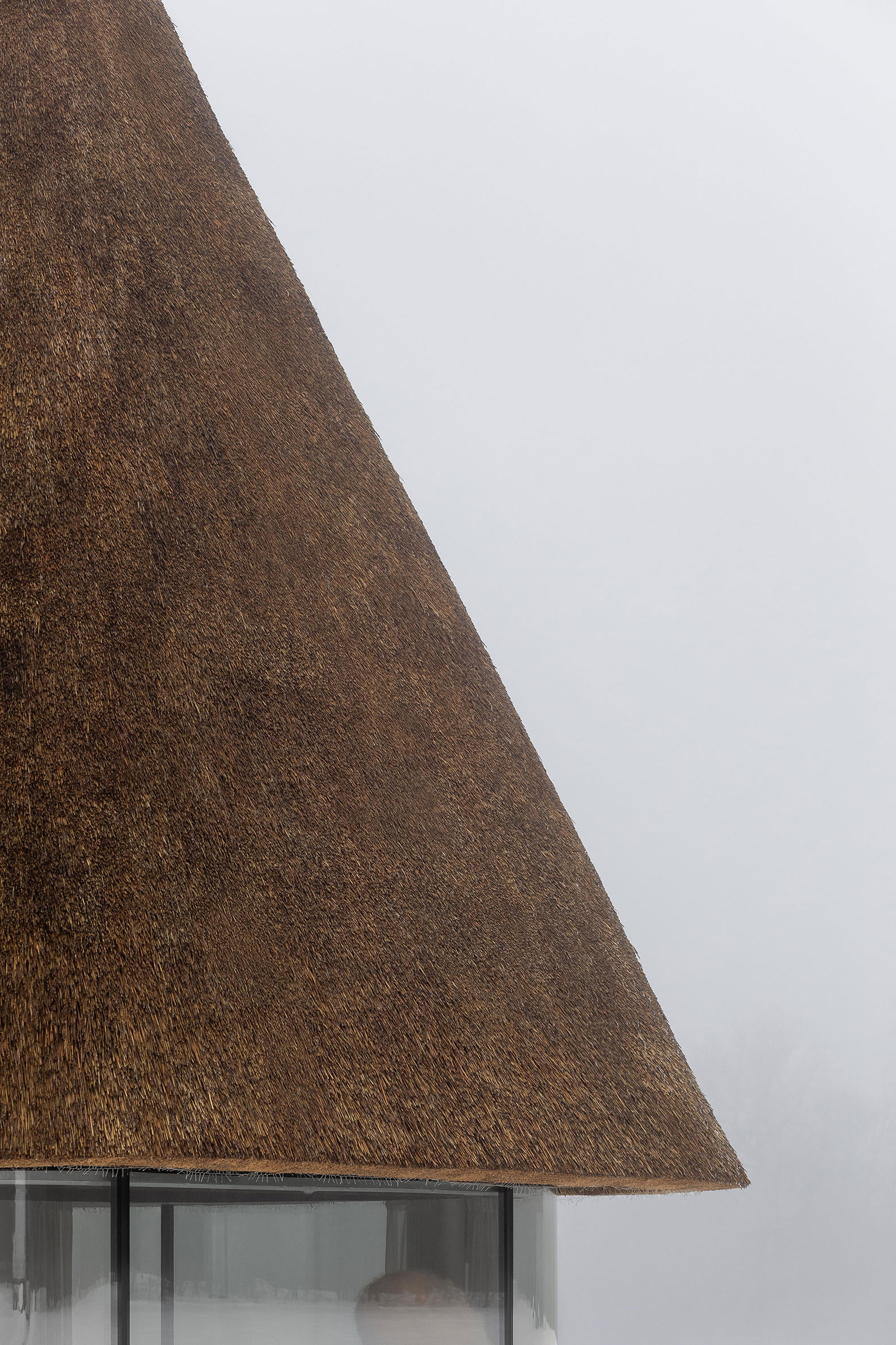 During the day, the fully glazed façades visually dissolve, creating the impression that the massive thatched roof is floating above the landscape. Inside and outside, the floor is finished with a continuous stone-carpet surface, pleasant to the touch and offering a subtle massage-like sensation when walking barefoot.