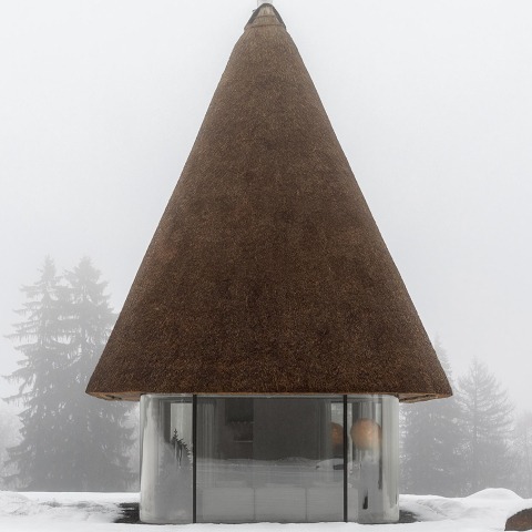 Its sculptural form defines a strong, instantly recognisable silhouette, evoking both a traditional tall hat and an oversized mushroom rising from the landscape.