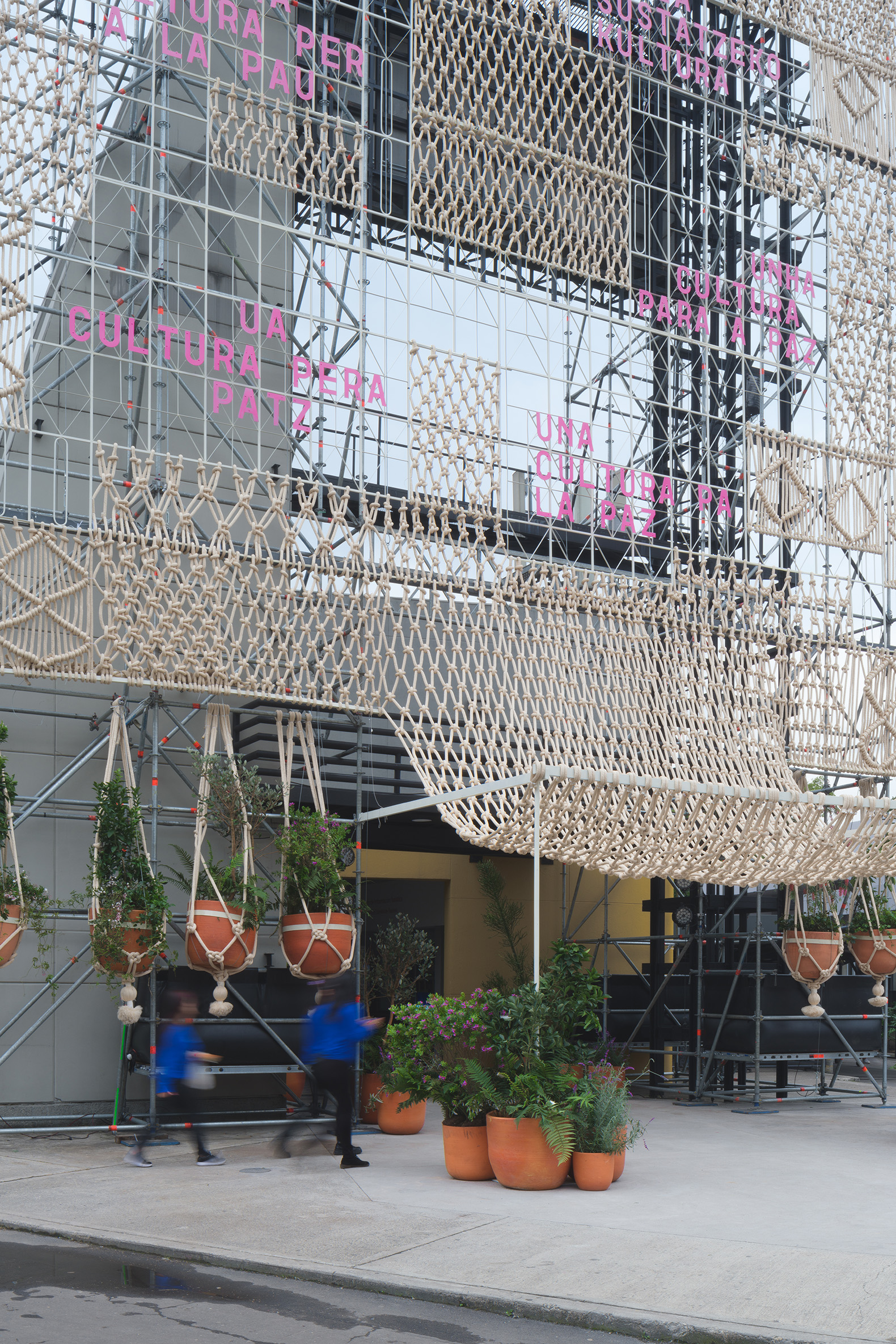Originating in the Arab world, macramé spread globally from the 8th century onward. As it expanded, it encountered local knotting techniques in nearly every culture. In the 15th century, the Spanish conquest brought macramé to the Americas, where it evolved into new forms through contact with pre-Columbian traditions. On the Pavilion’s façade, macramé becomes text: its knotted cords, sometimes reinforced with metal rods, serve as a base for lettering that welcomes visitors. Transcending its usual classification as decorative art, this textile piece takes on a quasi-infrastructural dimension—its scale and production process challenge the historically marginal status of textiles and their association with women’s labor.
