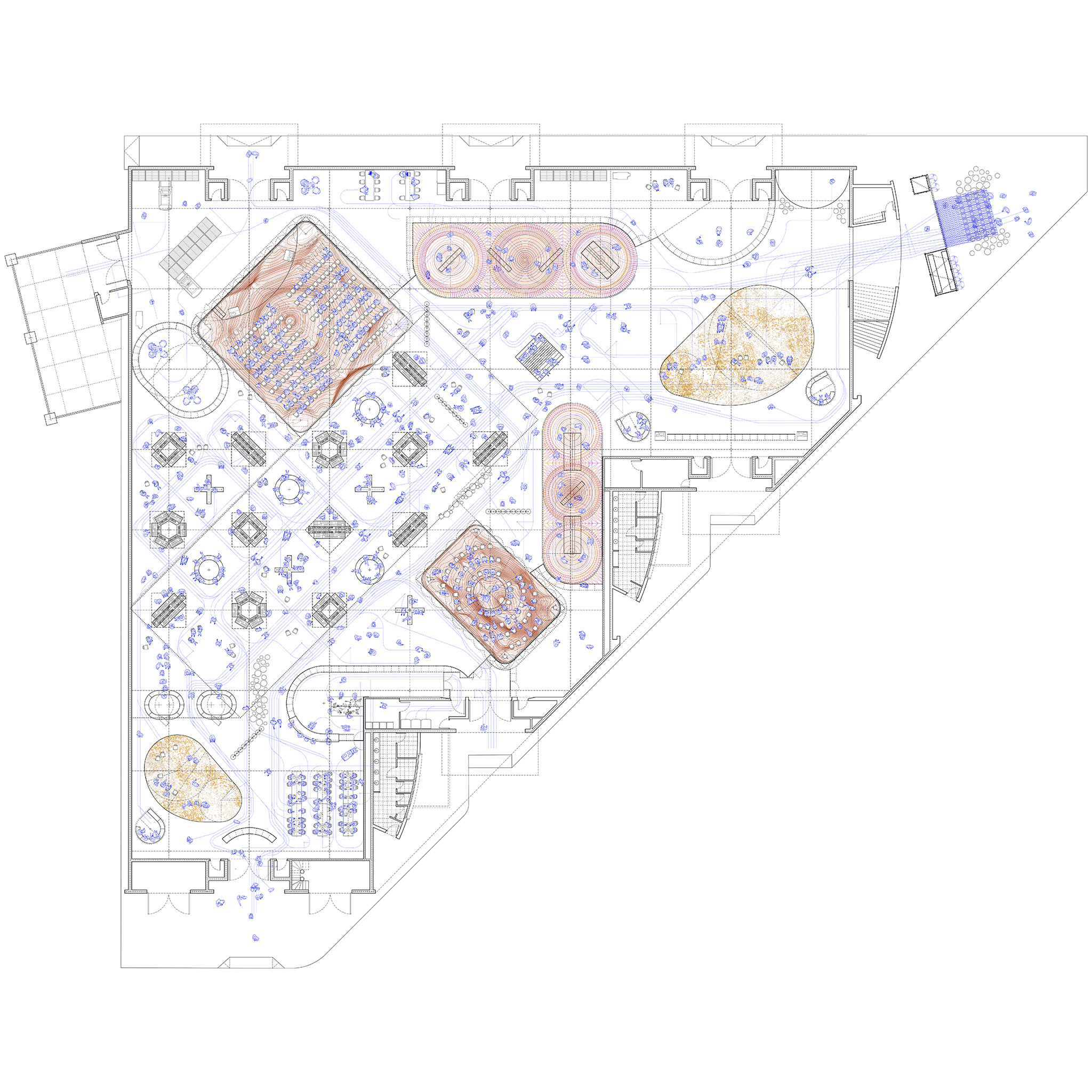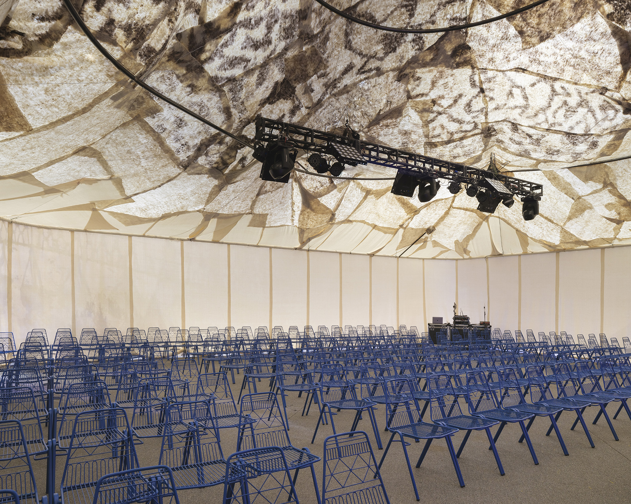 The diversity of handmade textiles throughout the Pavilion contrasts with its stainless steel surfaces, which generate interstitial spaces between the constructed landscapes and the Pavilion’s original architecture. These in-between areas house private entrances, service functions, and storage.