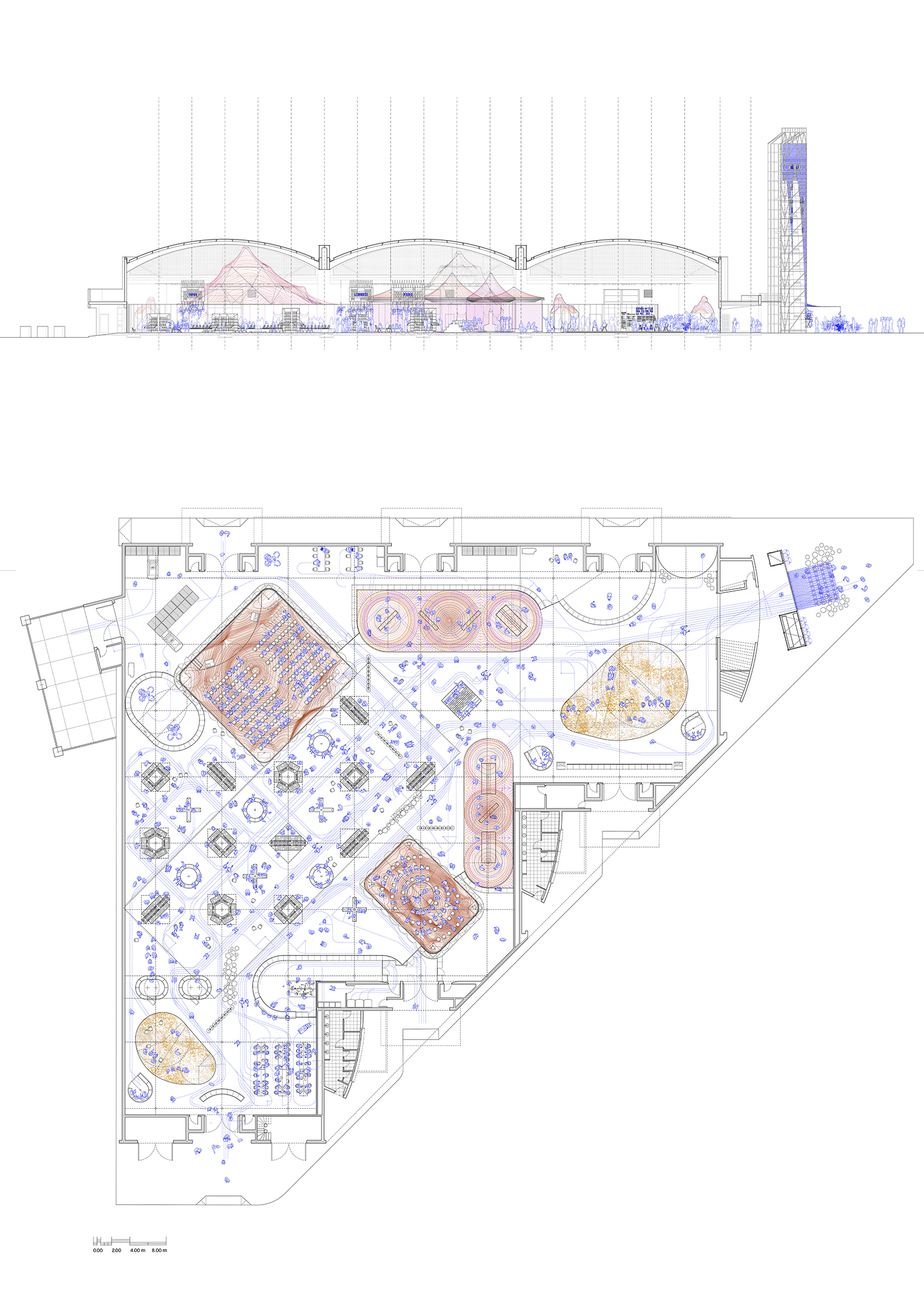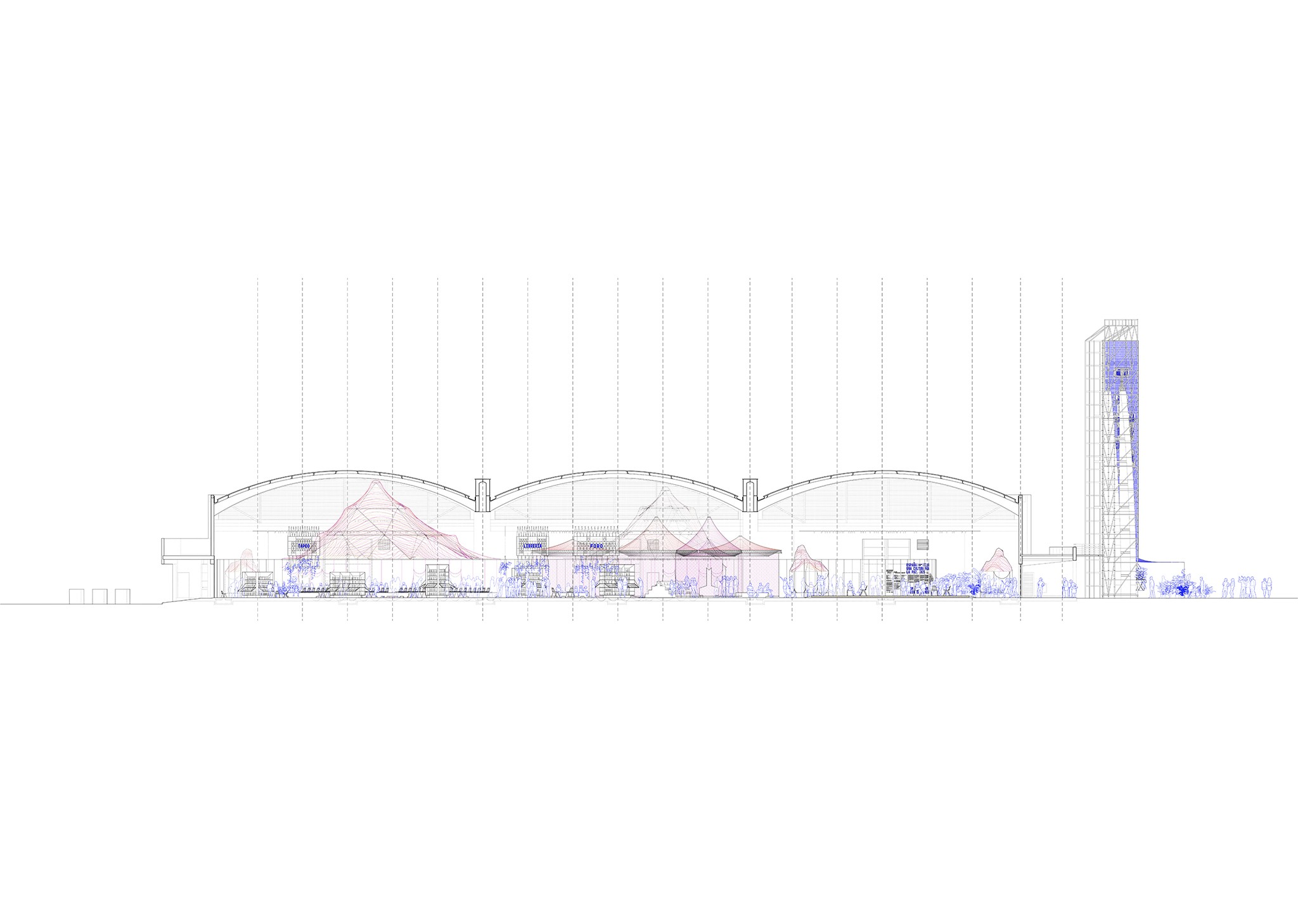 The visit to the Pavilion unfolds as a sequence of welcome, gathering, and farewell, articulated through different program elements. A large entry plaza introduces visitors to the curatorial proposal. From there, they access a series of spaces: an exhibition of Spanish photobooks; another on historical memory and graphic novels; a 240-seat auditorium; an 80-seat forum; and a large bookstore-reading area. Visitors exit through a second plaza that opens onto a terrace-canteen.