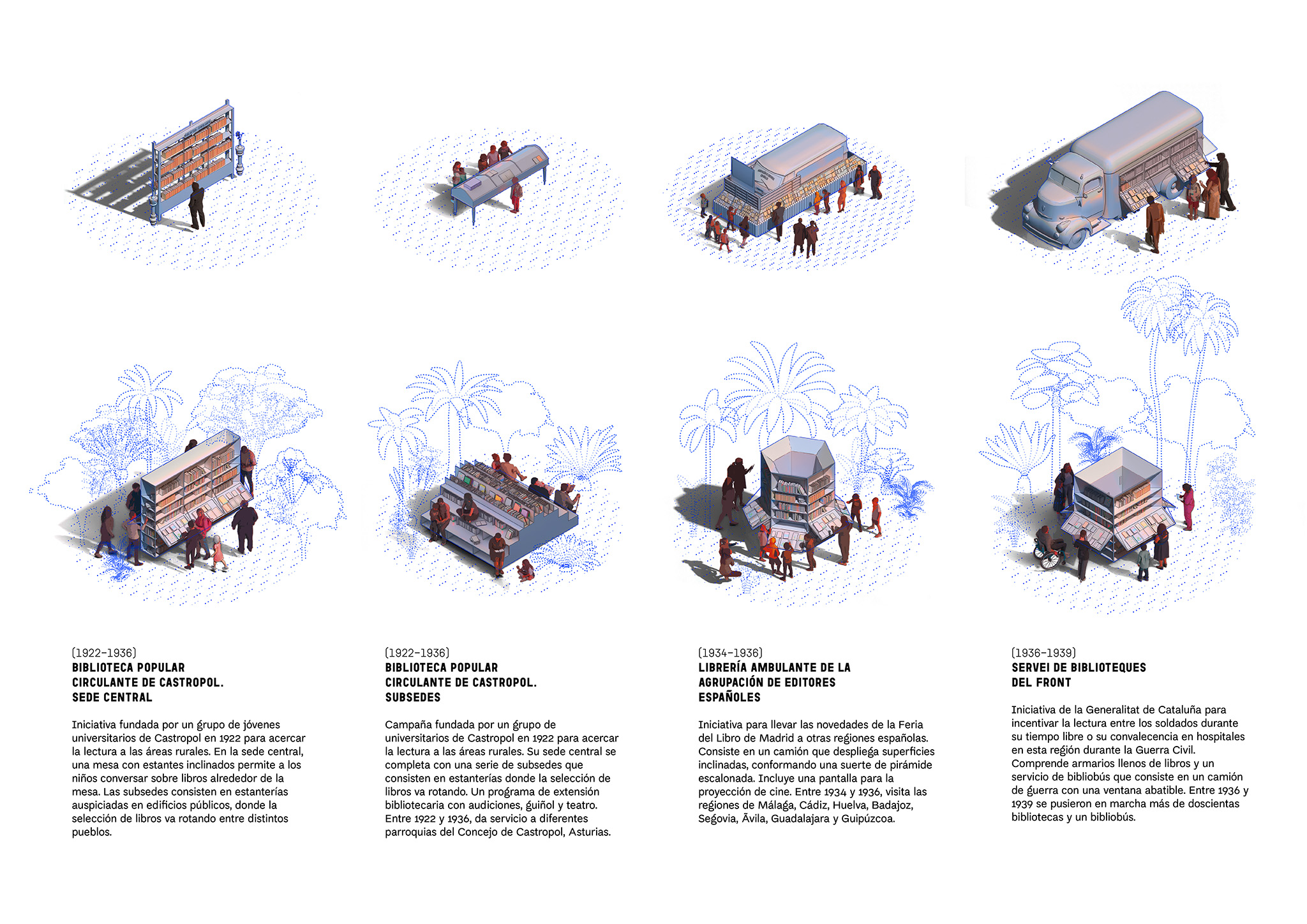 The Spanish Pavilion at FilBo 2025 is conceived as a series of landscapes connected by the movement of mobile libraries. Common in rural areas, these institutions constitute essential infrastructure for universal access to knowledge. Modest in scale and materially austere, they operate outside the logic of economic profit, linking readers in peripheral communities through their circulation. Historically, mobile libraries have played a vital role in both Colombia and Spain, providing access to books for broad segments of the population and often serving as a first point of contact with reading.