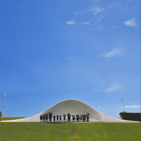 The two shells appear like white land forms emerging from the grass of the greensward. This is reflects the historical context of the concrete sound mirrors along the south coast at Dungeness, and the visually striking form of the local sand dunes.