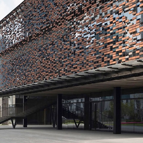 The western end of the façade is covered with a translucent screen, which is made of porous bricks fixed with φ 8 mm stainless steel wire. Density of the bricks changes as if to draw gradation.