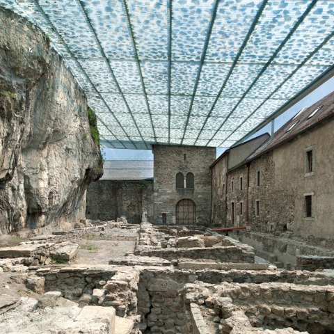 The abbey of Saint Maurice was built almost 1500 years ago. It is situated against a cliff in a section of the road between Geneva and the Simplon Pass. This particular site was likely to be chosen for its defensive position given by the cliff. However the planned fortification proved a failure due to rock fragments falling from the cliff onto the building. Throughout the history rockslides had an important influence causing several damages: In 1611 a huge rock fall caused a convulsion of the abbey, 1942 a rock destroyed the cross-spire and portal-nave of the building. Those slides have constantly been occurring and marked the site throughout history.