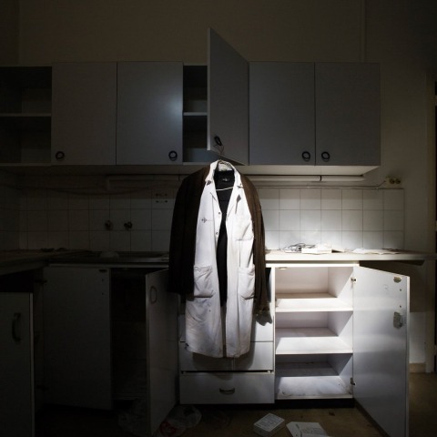 Once there, inside the halls and rooms, underground corridors, I found myself chasing the trail of all the people who had been there before me. Observing the folds of a forgotten blanket, an abandoned gurney in a hallway or a white robe hanging from the handle of a wardrobe, I could follow the traces of busy doctors, fast walking nurses, aching patients and worrying relatives and friends.