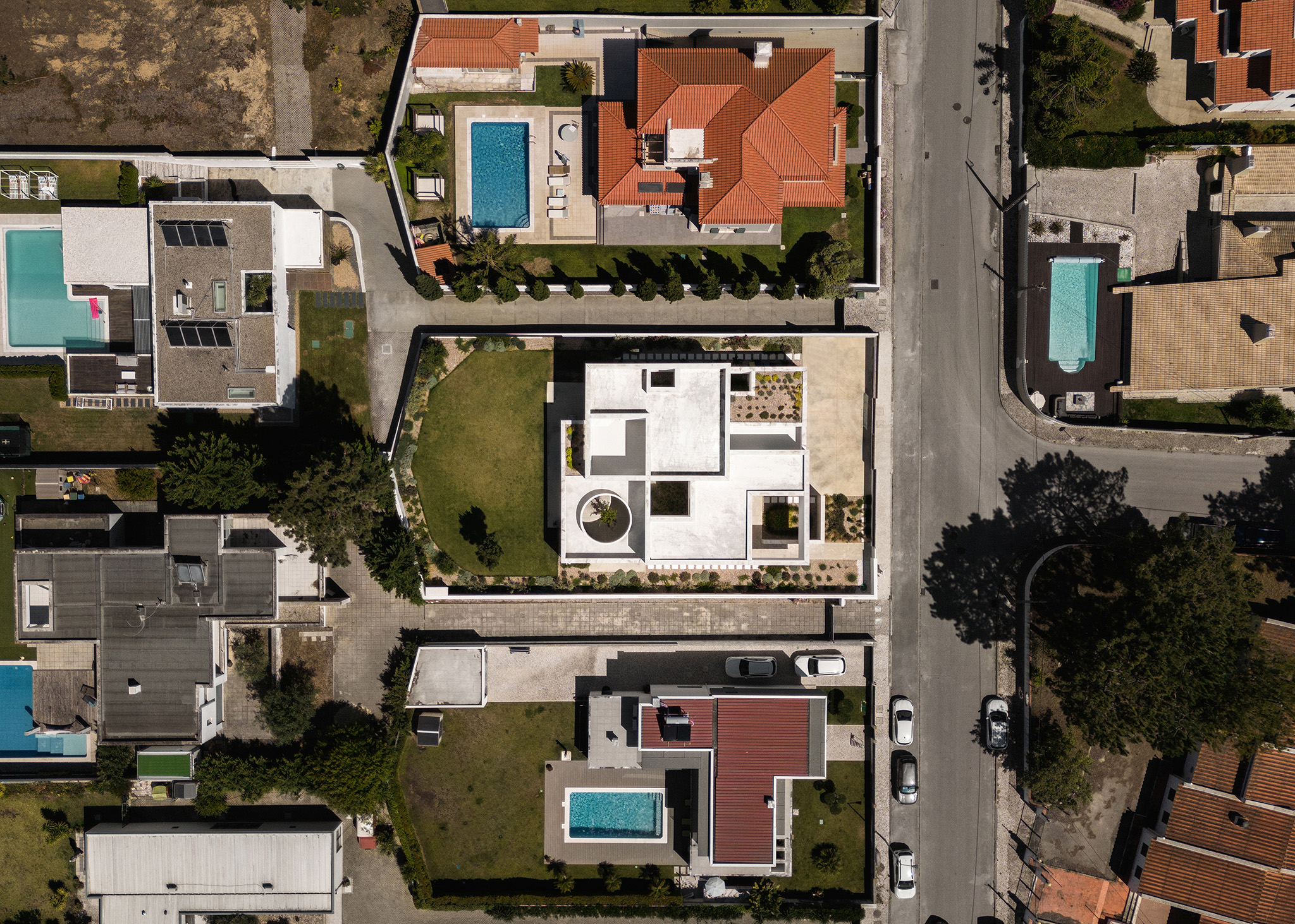 The project’s essence lies in its quiet strength: a protected refuge of white walls and purified surfaces, where life unfolds in rhythm with light and shadow. Courtyards become the heart of the home — bioclimatic instruments that cool in summer, shelter in winter, and choreograph the passage of time through light.