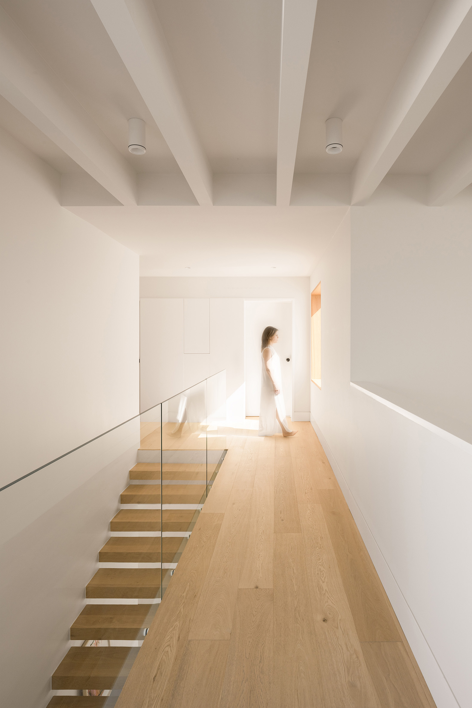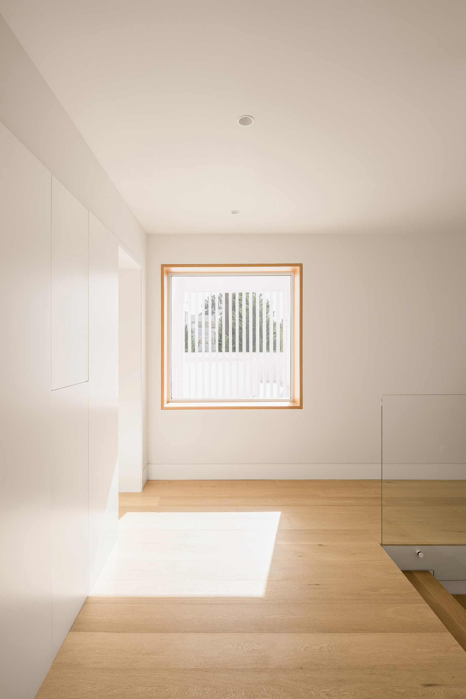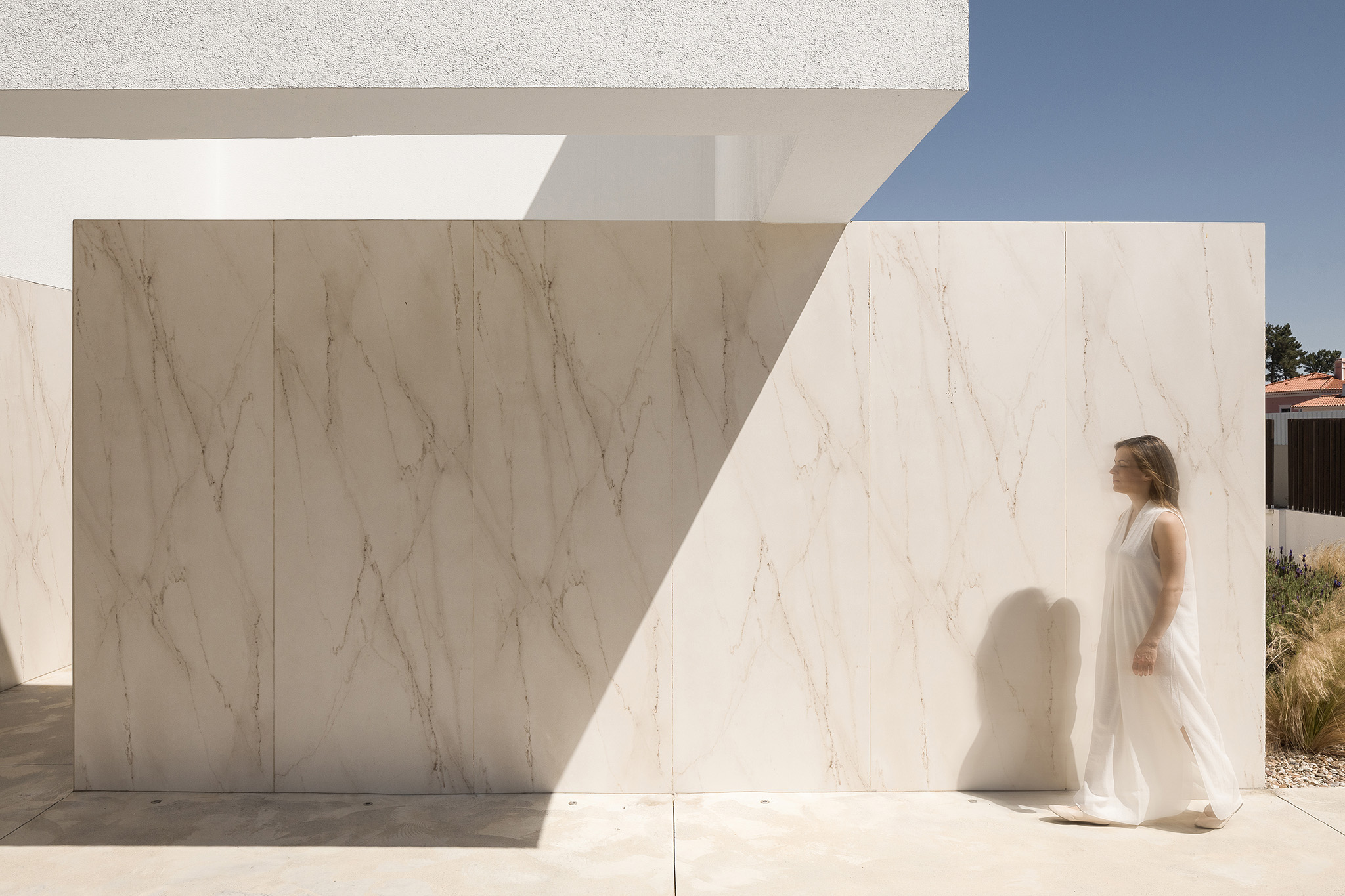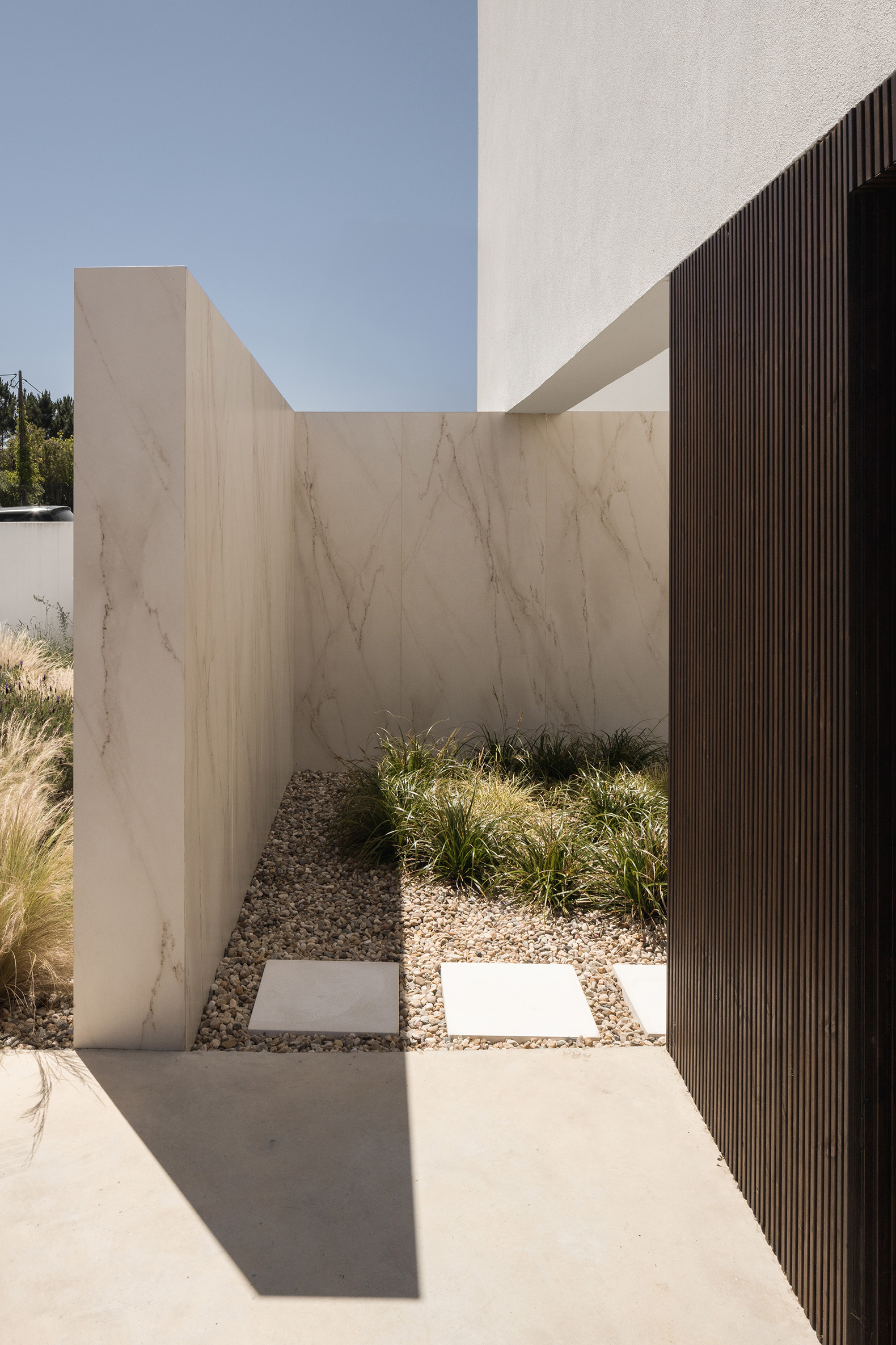 Architecturally, the language is restrained and sculpted by subtraction. Volumes are defined by voids, not excess, and the house maintains a discreet presence — tactile, luminous, and emotionally resonant. Materiality follows principles of honesty and permanence: ultra-compact sintered stone and thermo-modified timber create a dialogue between industrial precision and organic texture, while white slatted screens refine privacy and solar control.