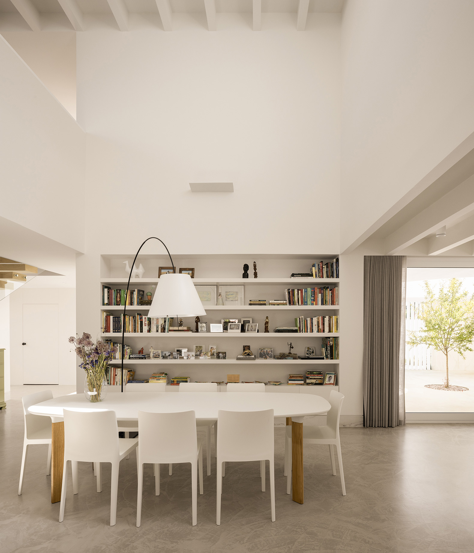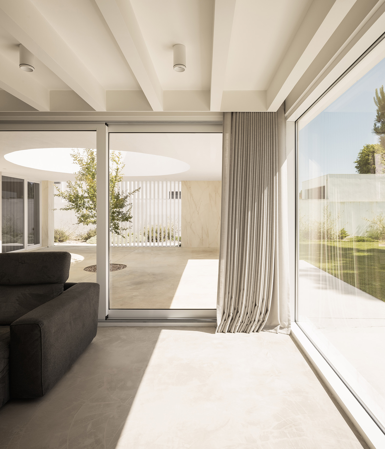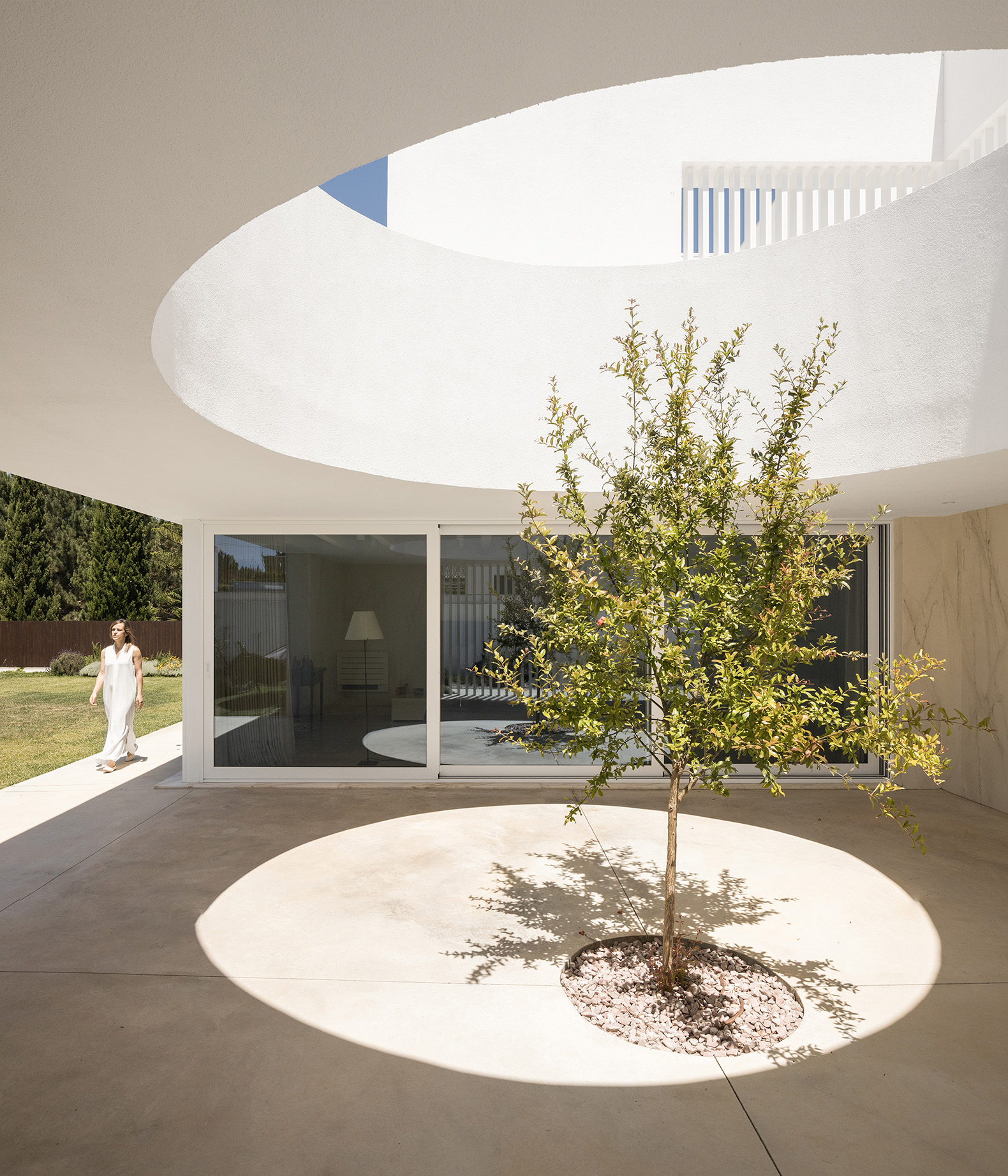 Programmatic flexibility allows the house to adapt to varied rituals and seasons. The living room opens to a courtyard centred on a pomegranate tree — a nod to Mediterranean identity. The kitchen flows seamlessly into an outdoor terrace, and a double-height void connects the two levels. Each courtyard plays a distinct role: the scenographic entrance patio, the central courtyard as seasonal protagonist, the lightwell for ventilation, and smaller patios offering visual and atmospheric respite.