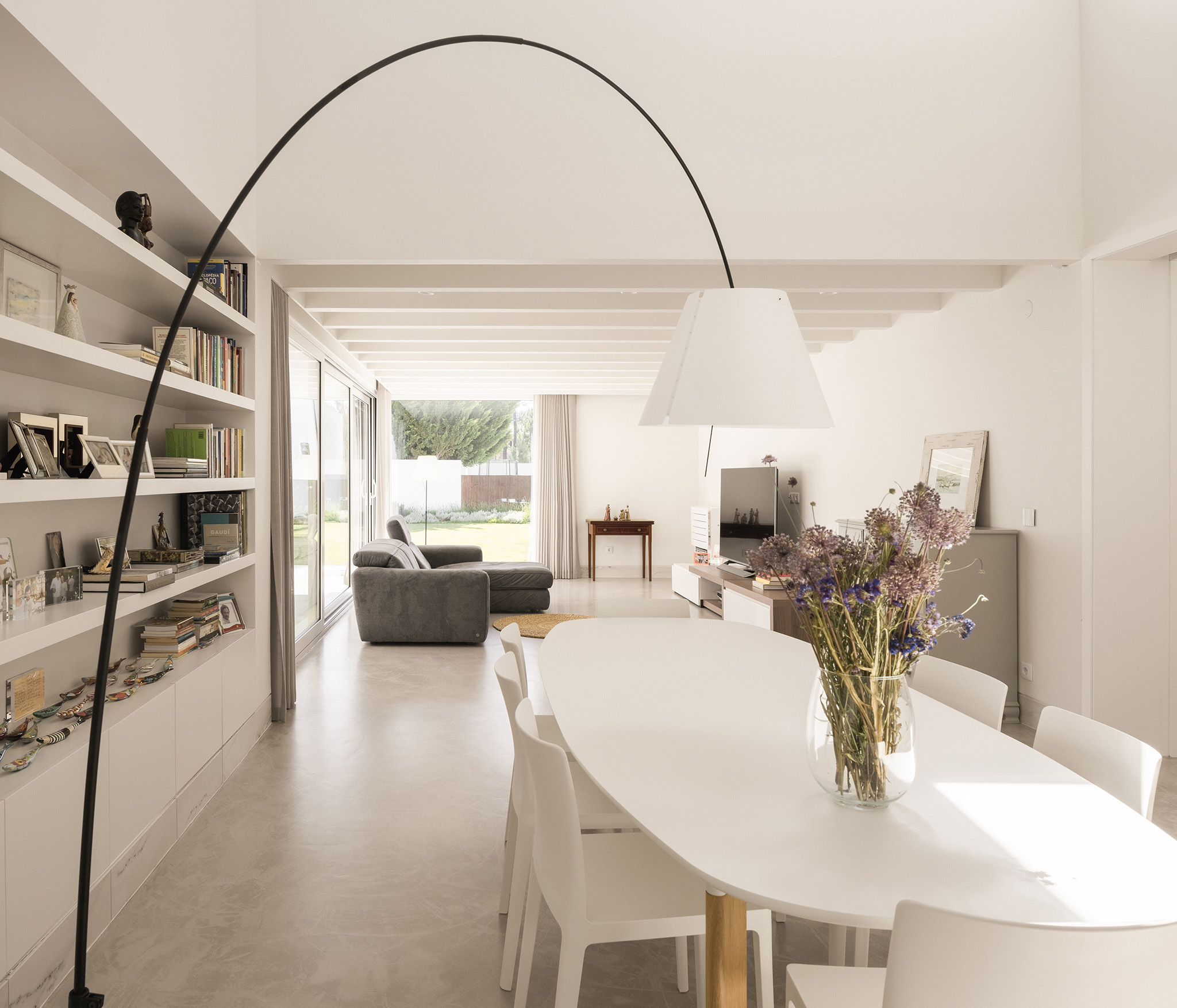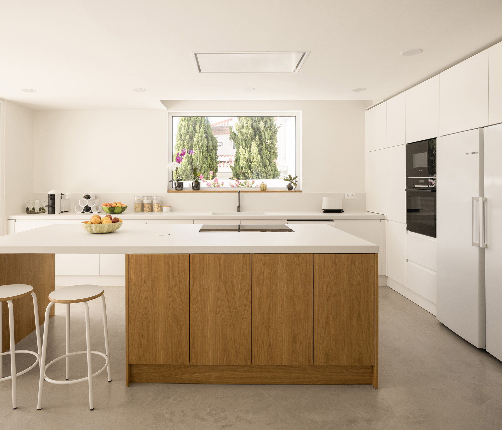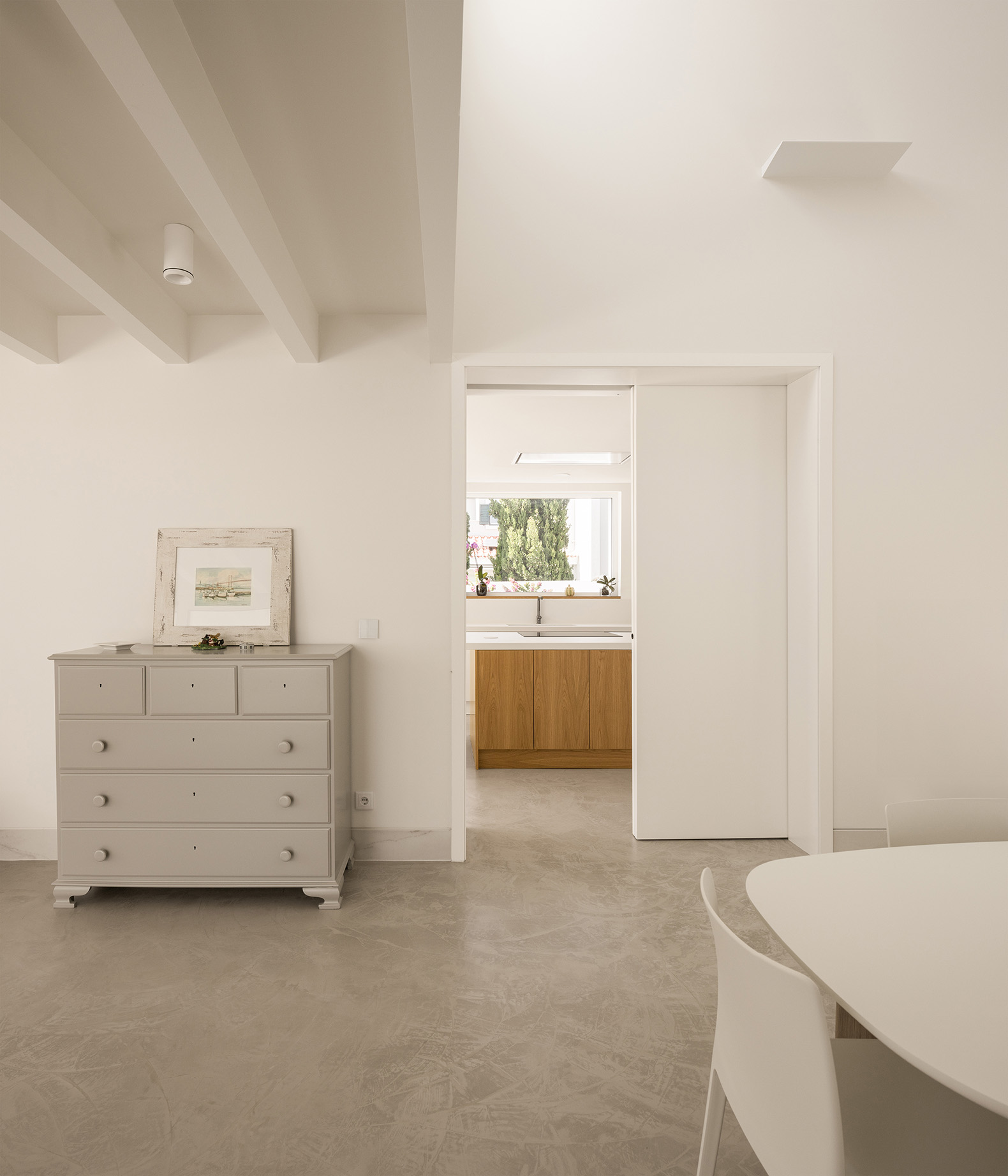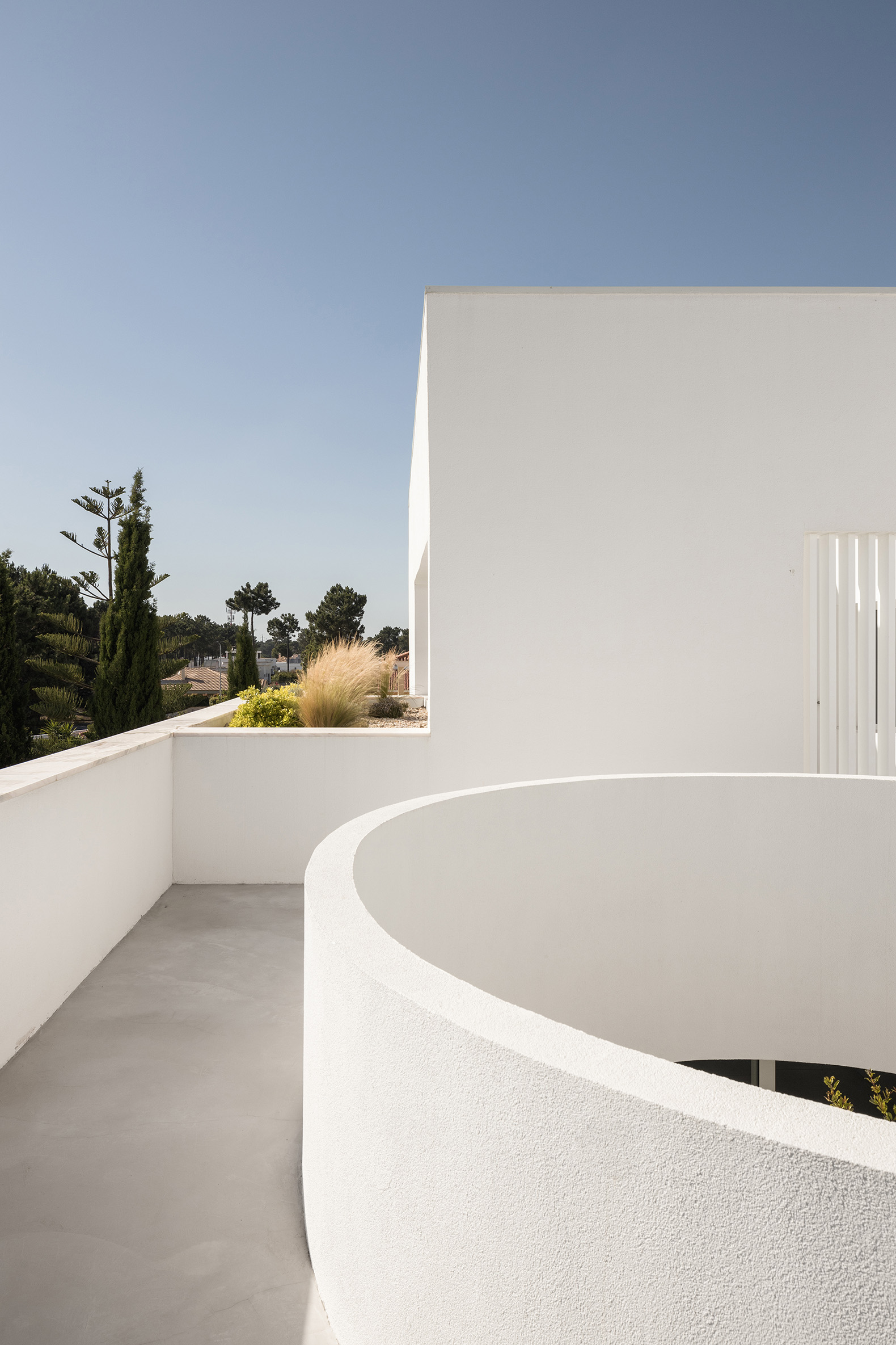 The carefully chosen palette of materials for Casa Verdizela reflects two fundamental concepts: sobriety and serenity. White walls and clean surfaces serve as canvases where daily life unfolds to the changing rhythm of light and shadow. Far from being imposing, the house suggests a slow and mindful way of living, in harmony with its immediate surroundings.
