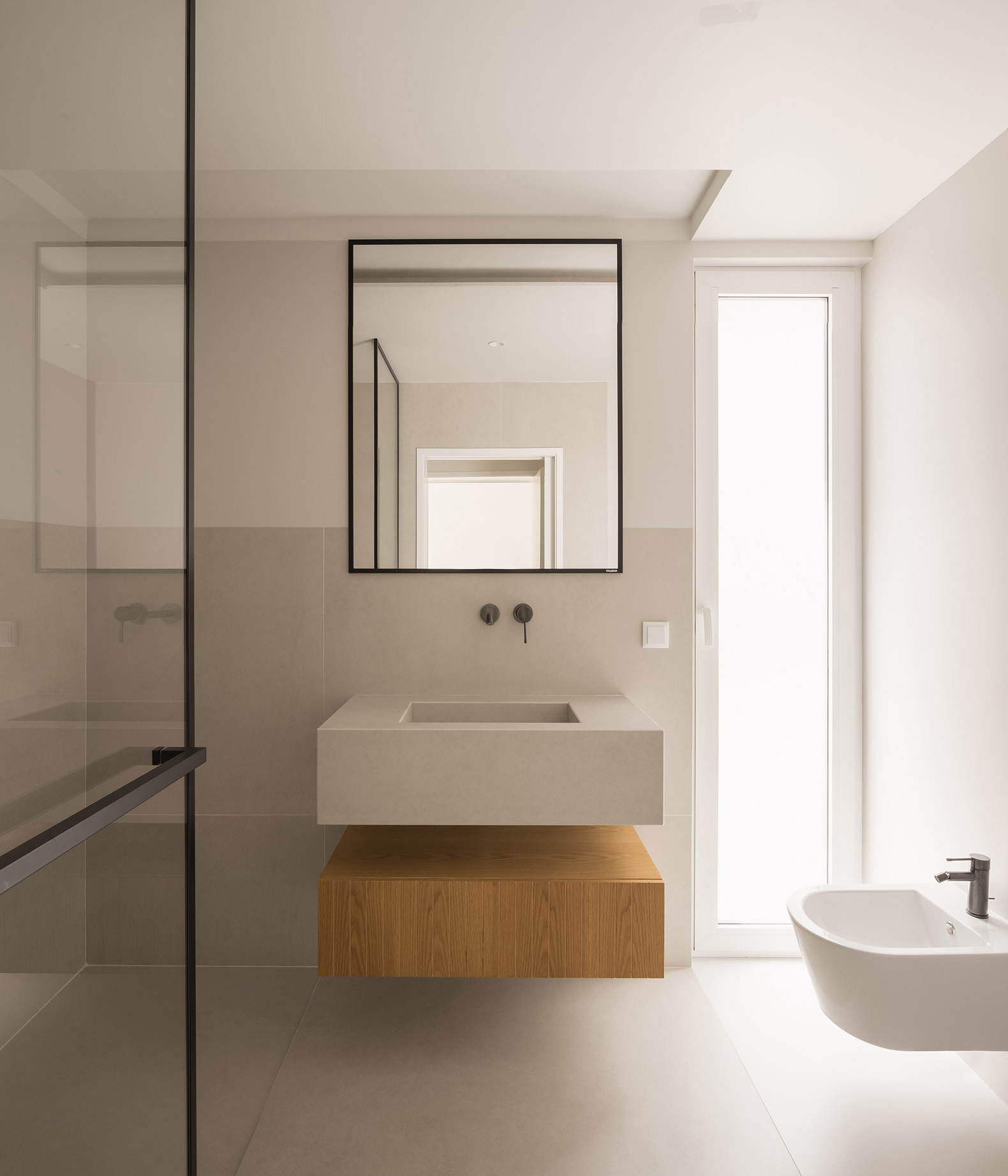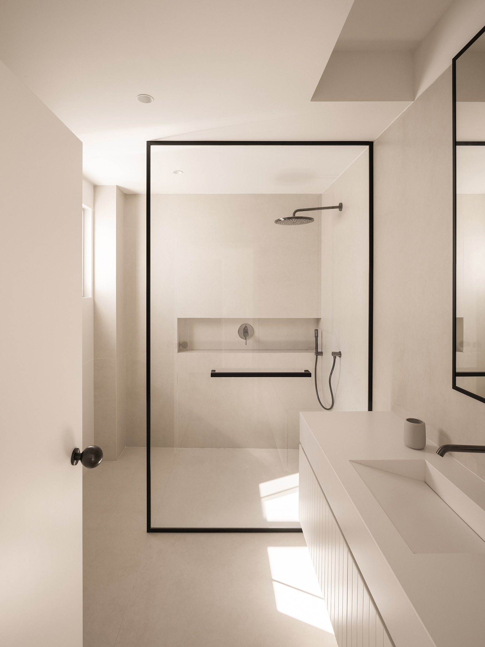 Inside, the palette extends the serenity of the exterior. Warm microcement unifies the social areas; natural oak flooring adds domestic warmth; sintered stone in wet areas affirms durability with elegance. Black accents punctuate the calm, infusing sophistication.