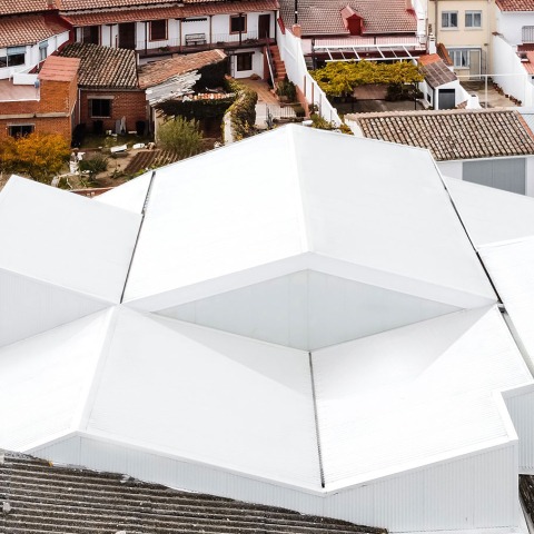 The roof skirts are broken up into several smaller inclined planes, playing with different inclinations and slopes with three purposes: one, functional, so that it defines and characterizes the different work areas inside, but without compartmentalizing, allowing the entry of natural light where it is needed and with the required orientation; two, urban planning, so as to volumetrically integrate the building into the plot of small roofs, avoiding a resounding volume that breaks the harmony of the urban environment; and three, symbolic, because the logo and commercial image of the winery is a paper boat , and this shape is noticeable from the surrounding vineyards and the access road to the town, which, being sunken, allows us to notice the set of white roofs of the winery among those of the farmhouse, standing out as an inserted object but at the same time integrating it into the whole .