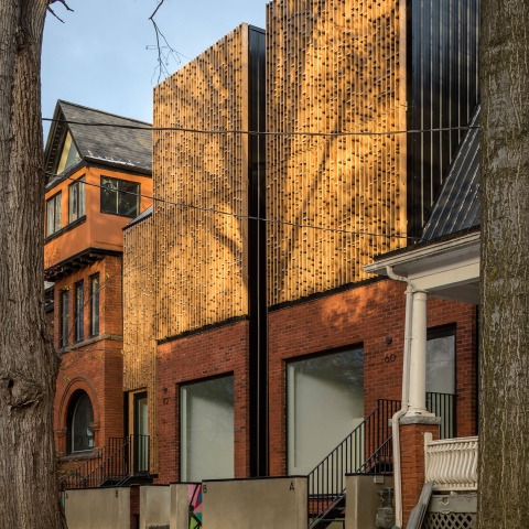The project also represents strategies for dynamic and spatial integration of exterior and interior spaces within a typical narrow and deep Toronto infill lot. Each duplex residence consists of a two storey lower unit and a two story upper unit. The lower unit is carved out in the front and back with double height volumes that flow out to sunken courtyards maximizing the amount of natural daylight entering the unit and transgressing the basement apartment stereotype. The lower unit's courtyards are wrapped in brightly painted murals by local artists. The upper unit is organized around a double height atrium space which brings natural light and ventilation into the center of the unit. Two exterior courtyards punctuate either end of the floor plate behind the wooden brise soleil, to the front a double height balcony overlooks the street and to the rear provides for a master bedroom terrace.