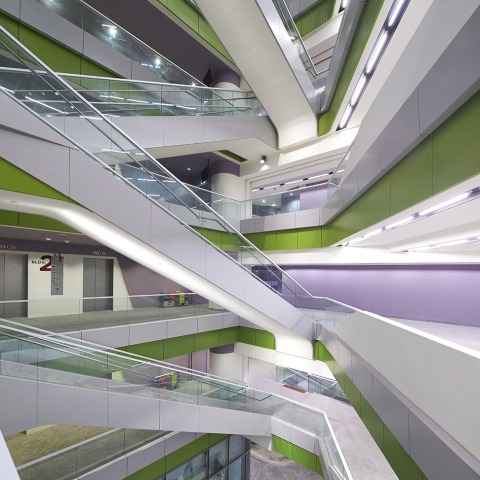 The SUTD is a highly sustainable building, incorporating numerous passive design strategies designed to counteract the conditions caused by Singapore’s tropical climate. Based on extensive orientation and wind studies natural ventilation principles are applied throughout the design, alongside cooling techniques, covered walkways, louvred facade shading, open voids, extensive daylight to the interiors and protection from heavy rain showers.