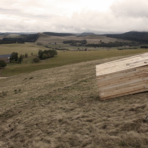 Sloping House is a makeshift shelter that clings to the side of an extinct volcano in the Puy de Serveix, in France's Massif Central. Built from recycled timber by the artists themselves, this sculptural one-person refuge, seems to erupt from the grassy slope, as if the structure's wooden planks are being flung out of the earth only to reform into the neat lines of an archetypal hut.