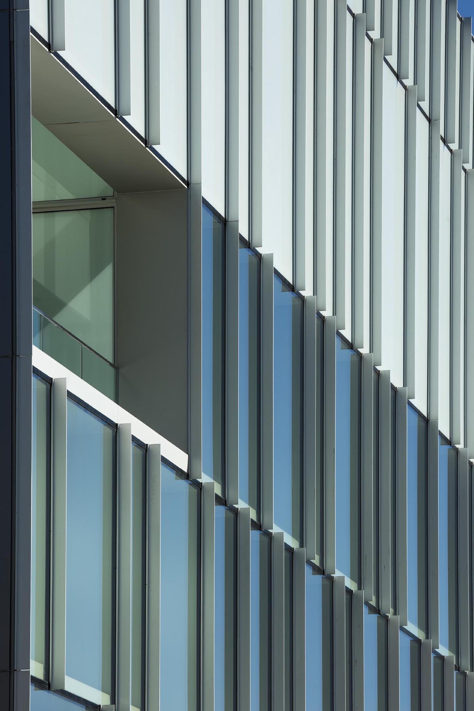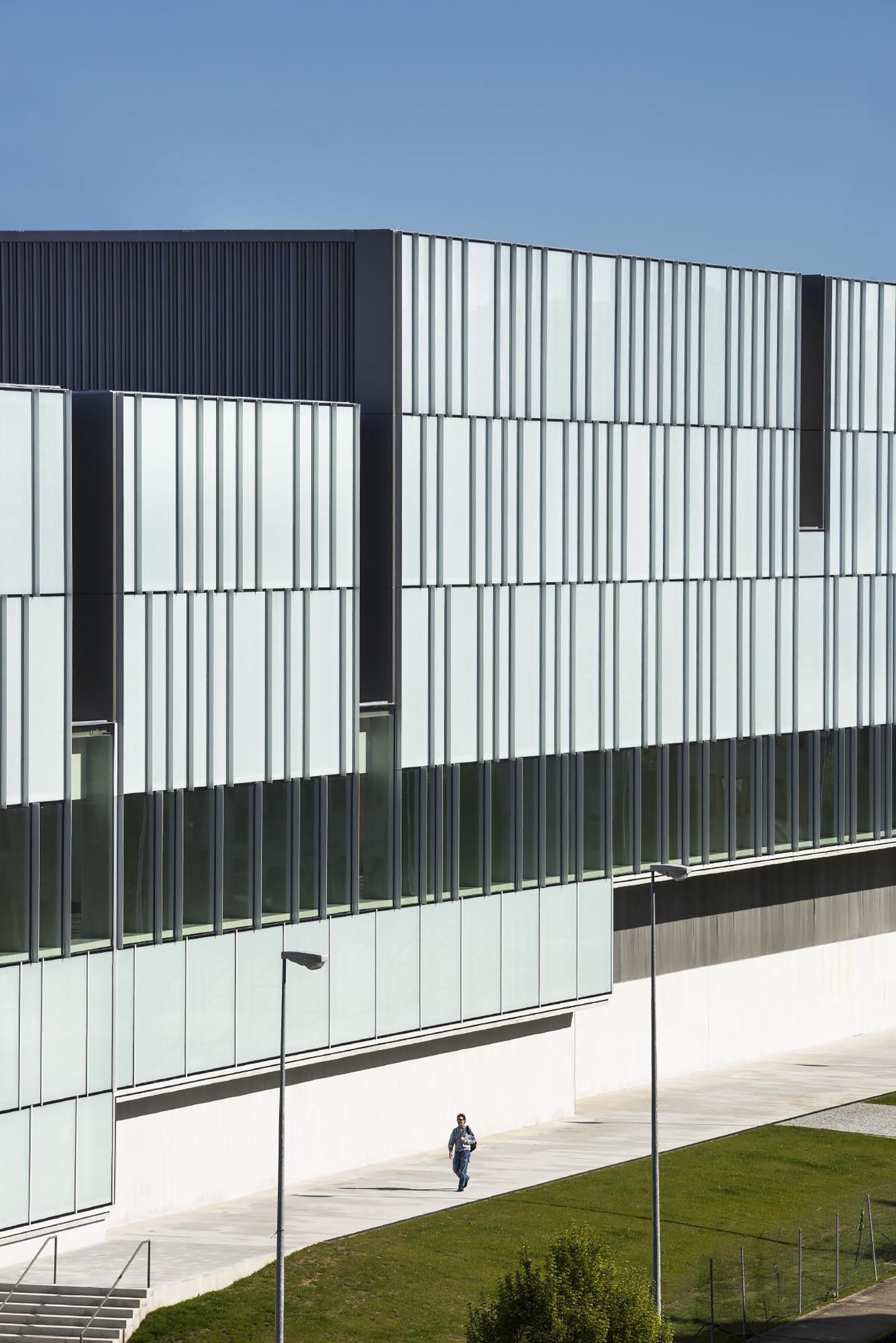 Despite its considerable size, the building is perceived as a volumetrically integrated and visually light complex, partly thanks to the use of lightweight materials and the large transparent surfaces that punctuate its façade, occupying a significant portion of it. The envelope is characterized by screen-printed glass panels of varying opacity, using a curtain wall system. For the remaining opaque parts of the façade and roof, folded aluminum has been chosen as the finishing material to cover these surfaces.