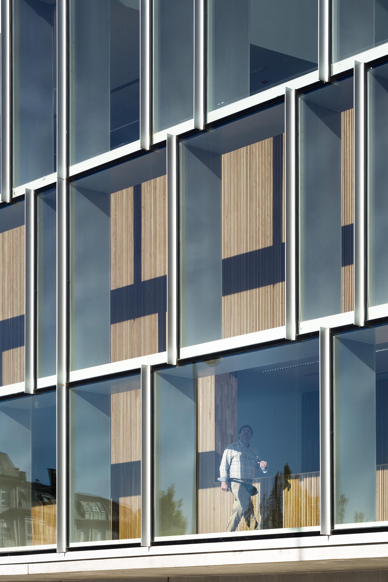 The aluminum roof folds to envelop the various spaces, each with the necessary height, and creates a broken cornice that distances it from a monolithic image. Like a gallery, sometimes translucent and sometimes transparent, the silkscreened glass façade of varying opacity gives the building a luminous character and creates the most urban aspect of the Auditorium, creating a building that represents an institution open to the public. The image is flat and continuous toward the street, with varying heights, and fragmented in the garden, where it offers an irregular silhouette that barely stands out from the treetops.