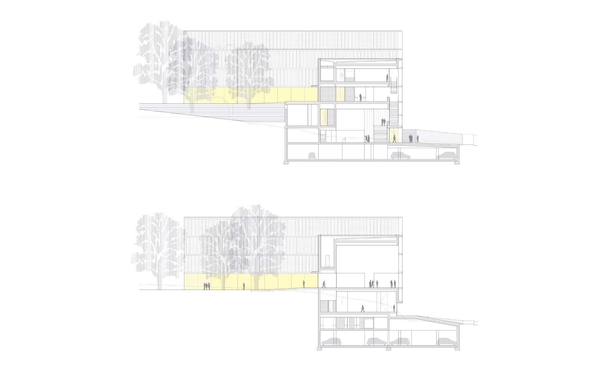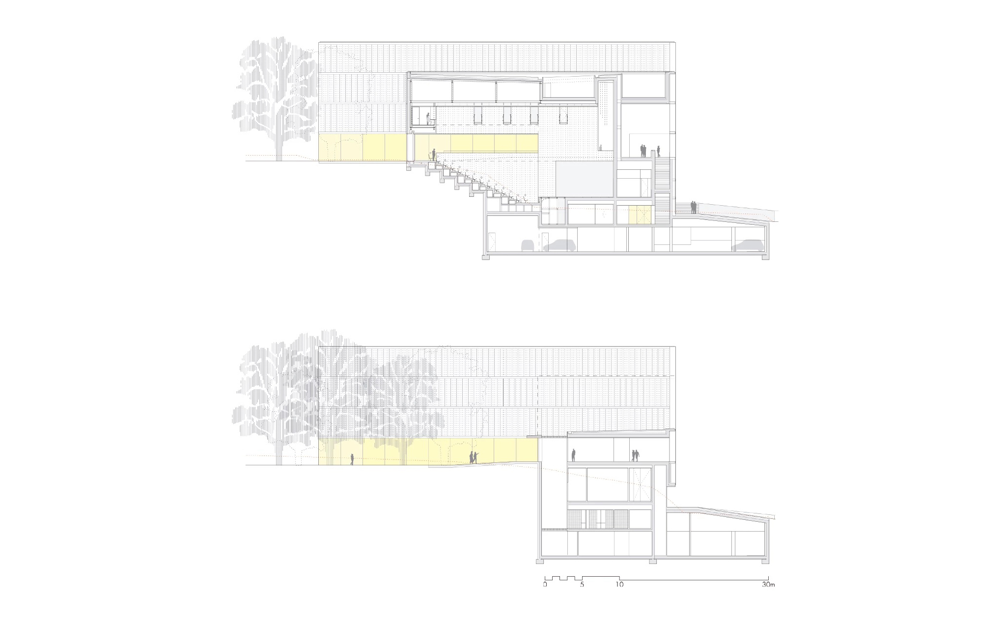 Between the transparency of both sides, the interior is organized linearly with a functional spine. The two auditoriums, with 900 and 300 seats, rest on the natural profile of the terrain with a single slope, incorporating the view of the gardens and natural light at the back of the stands. Access to the auditoriums is through the garden, and from the avenue, access to the exhibition center. The tall, continuous lobby connects the routes and articulates the voids of different heights, enhancing these powerful meeting spaces.