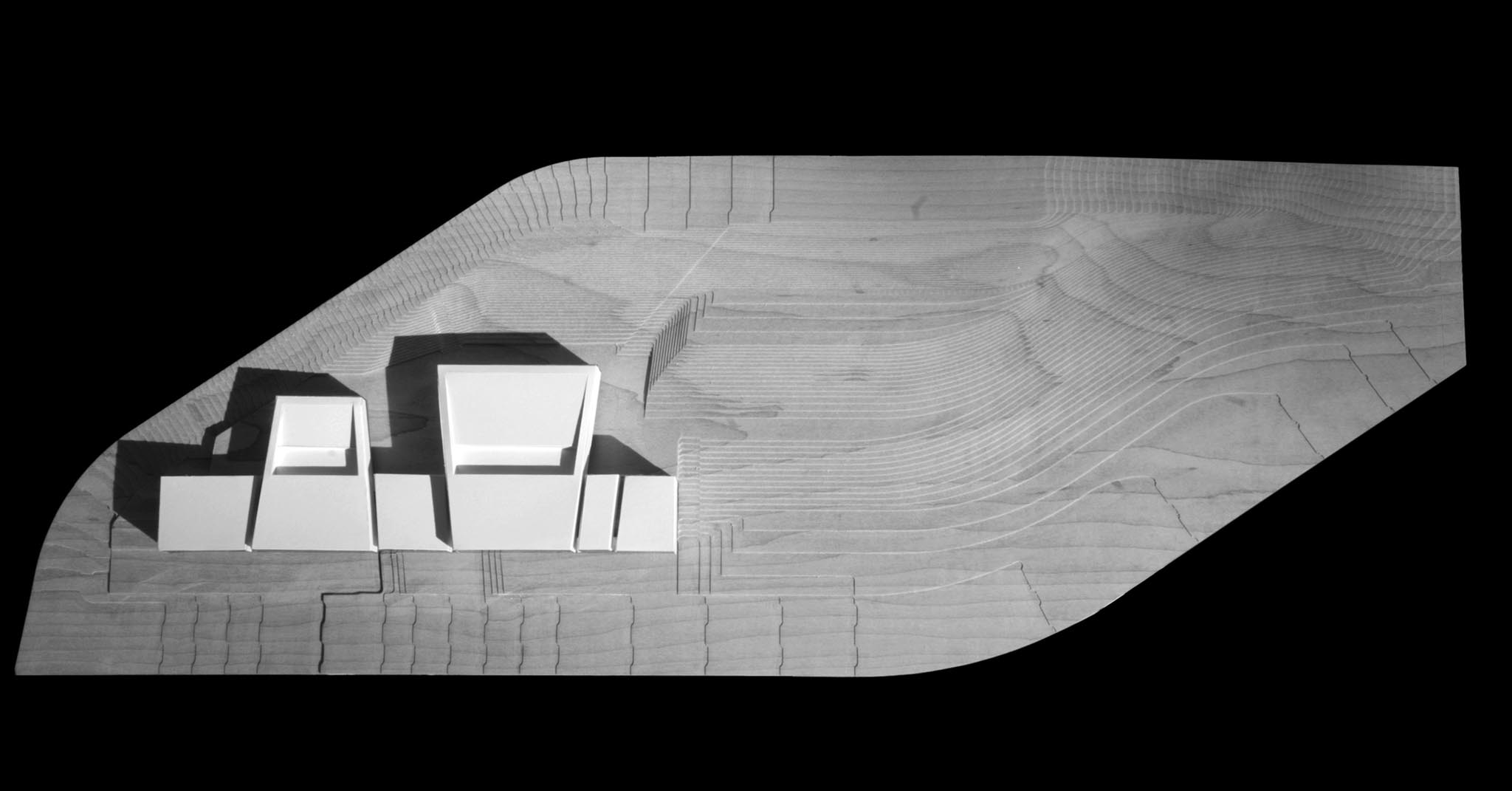 The Auditorium, organized as an elongated volume between two levels: the urban level of the avenue and the upper level of the gardens, with a seven-meter slope, has a powerful topographical condition, like the wall of Lugo. This condition allows the topography to be used to the project's advantage and minimizes the necessary height of the stage tower, creating a continuous urban profile facing the city and allowing for an elevated garden access to the Auditorium facing east, a green and silent anteroom to the building.