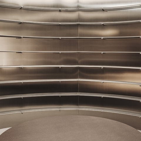 This stacking of elements refers to the wood drying rooms and the cork sheets themselves - with their arrangement to maximize air circulation - and allows the product for sale to be arranged simply by resting it on its emerging shelves.