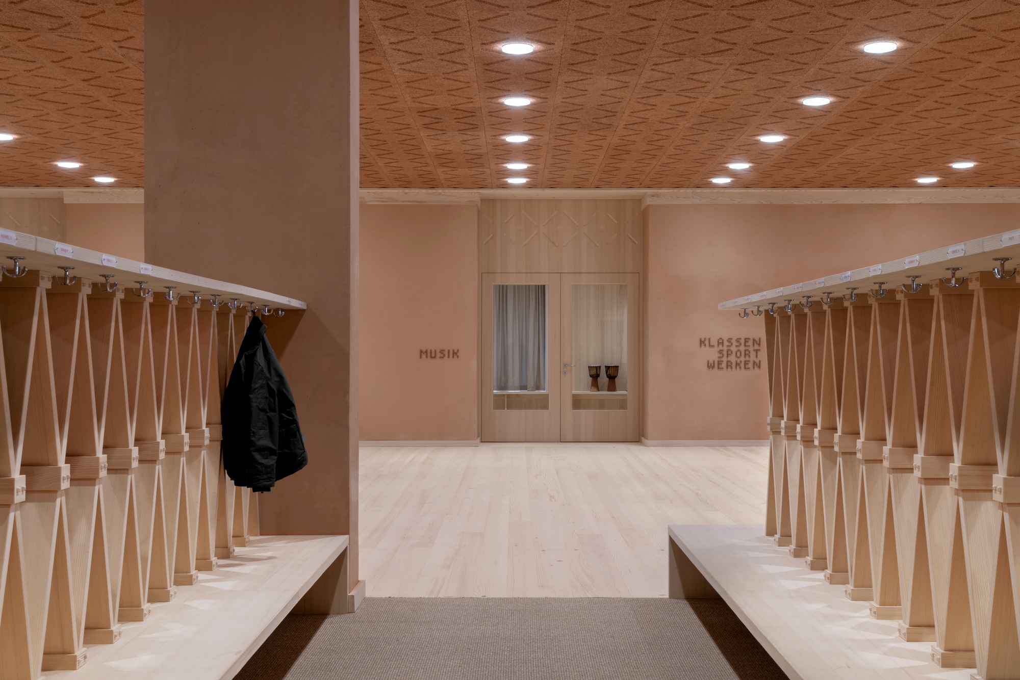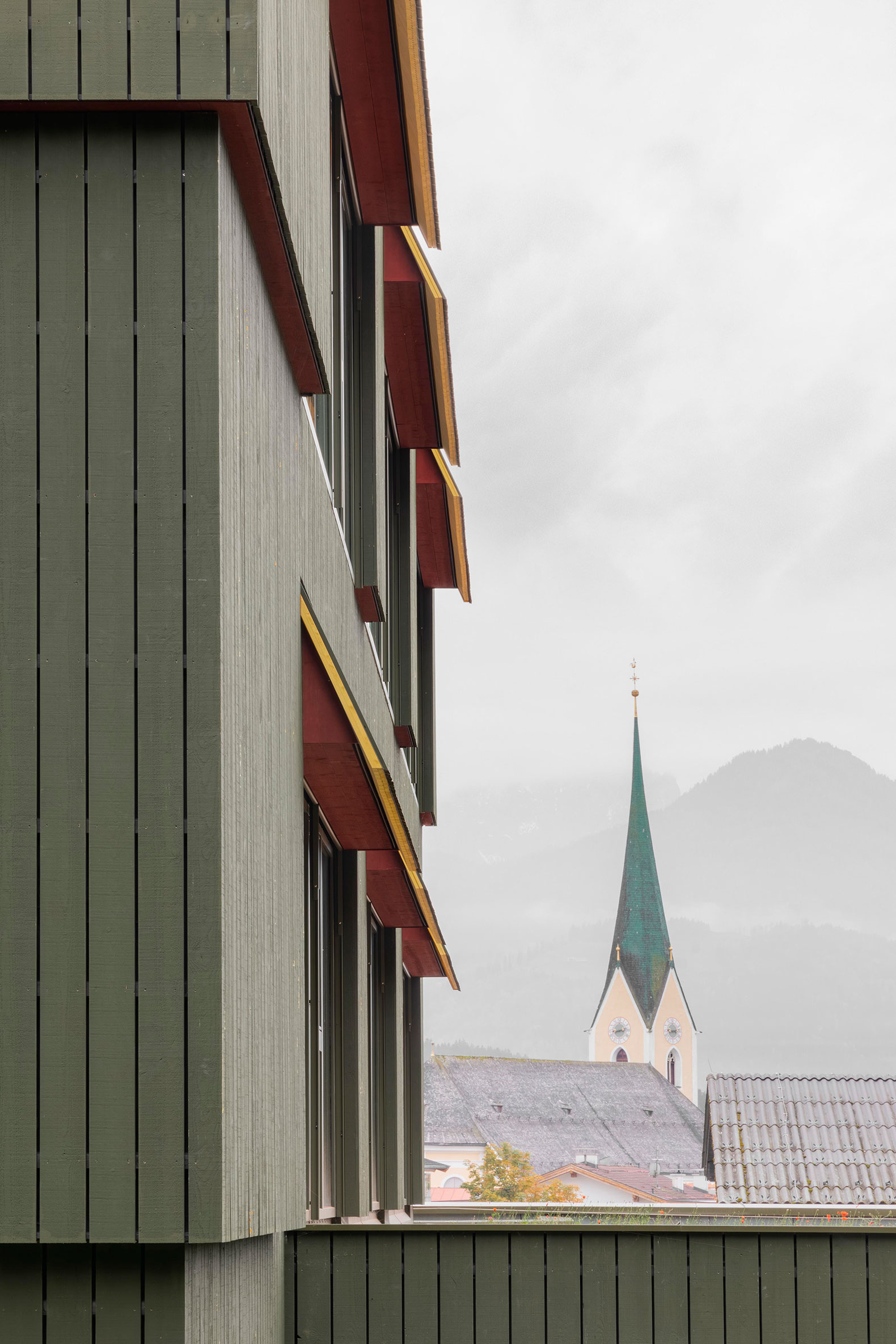 Like the large, solid rural houses, the educational center seeks to project a serene and natural presence into the urban landscape. The kindergarten, the school, and the after-school center each have their own entrance, all oriented towards a common, covered entrance area. The gradation of heights simultaneously structures the exterior spaces. Interior and exterior are not conceived as separate worlds: the spatial configuration becomes an open educational landscape. The building's colour palette is also closely linked to Kössen. The exterior envelope is designed to be both durable and resistant to everyday use. Inside, a distinct set of natural and regional materials is defined, deliberately allowed to age and mature naturally.