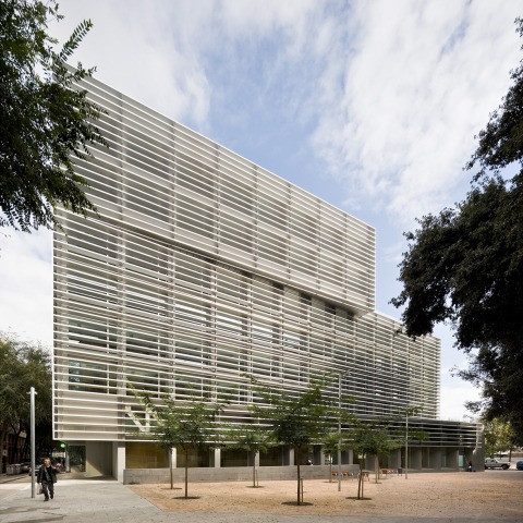 The need for natural light which is determined by the administrative use of the building is resolved with the large windows in facade which are protected from the incidence of direct solar radiation through a continuous envelope of aluminum slats. These slats give identity to the building facades: they are arranged horizontally along the main facades of the building (longitudinal facades) and in vertical on the beams. The use of a framed structure with pillars in facade allows for open floor plans that are organized from two vertical cores, leaving the rest of the surface free. The partitioning is done through lightweight partition wall. In this way, the building allows a versatility of occupation in time."