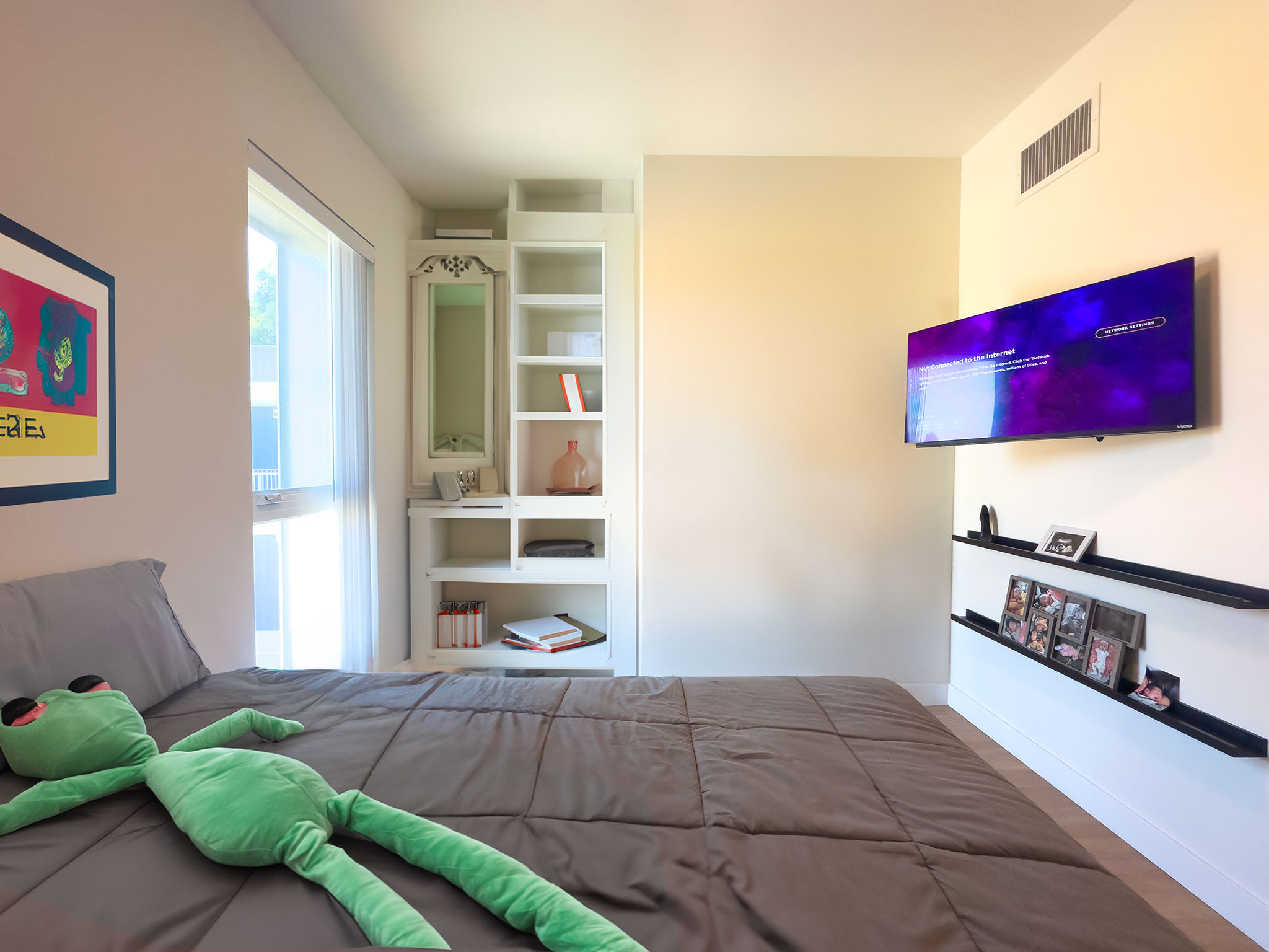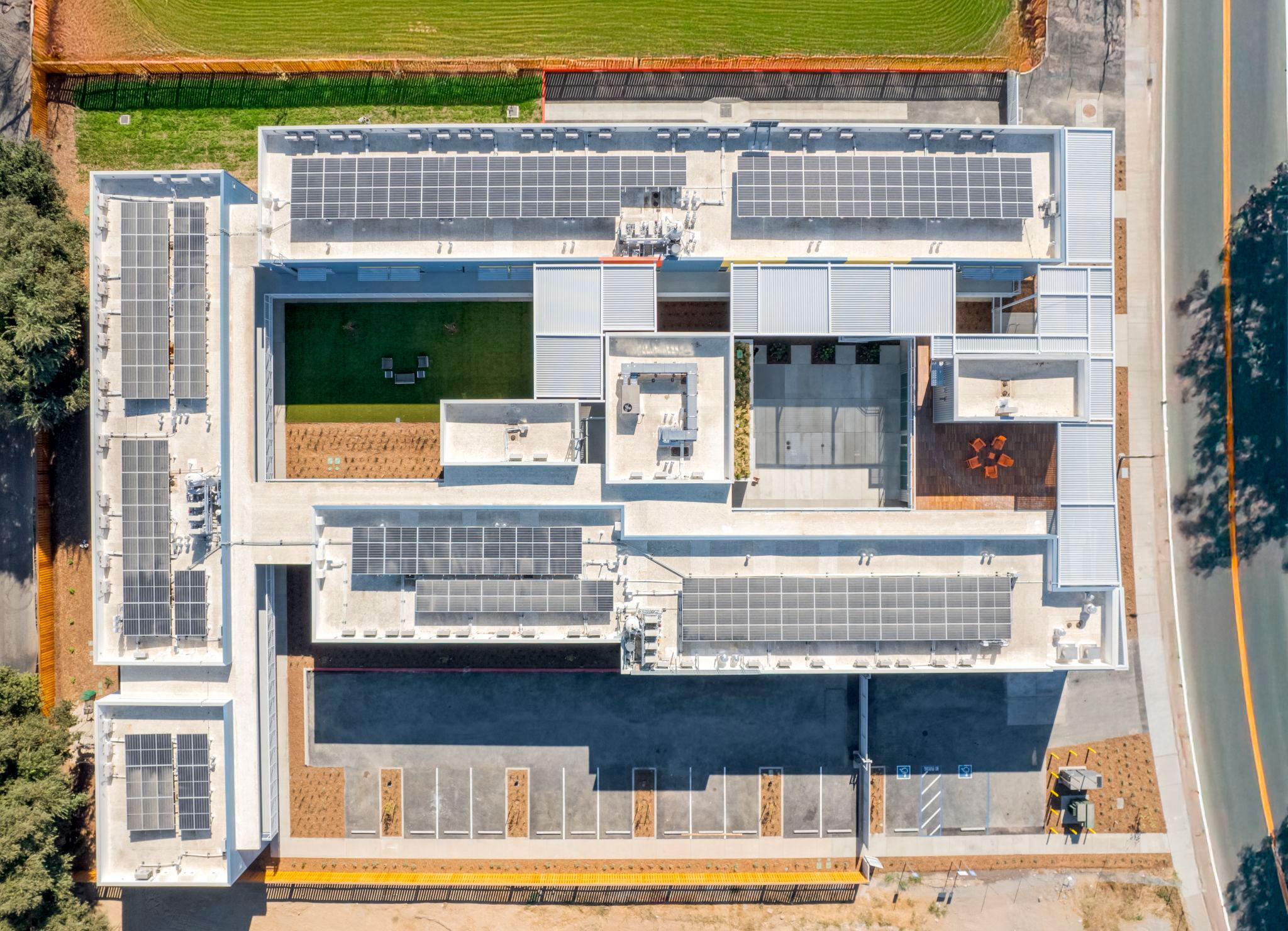 The perimeter two- story structures provide ample cross ventilation that are shaped to form and view over two social spaces; a centrally located garden and social courtyard. They include breezeways thru the building that allow easy access from surrounding gardens and parking, which also, induce airflow thru the central spaces. Strategically placed between them is a community room and other indoor amenities with large sliding glass doors that open and connect directly to both exterior spaces on either side. A two-story trellis above provides shade and dappled light to the LEED Platinum building.