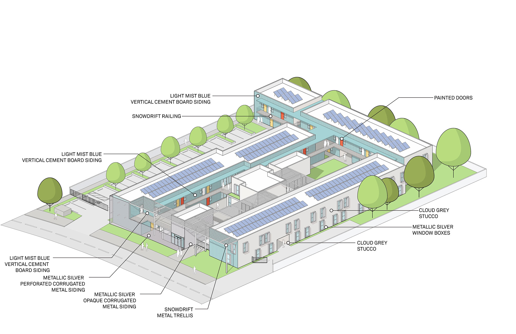 Northview Apartments eschews the typical neighborhood defensive apartment buildings with solid walls and fences in favor of a carved-out central court, a beacon in the neighborhood that celebrates social space by de-emphasizing private space. Strategically placed windows, purposeful exterior circulation and units that wrap the outer-most edges, orient the 67 low-income apartments to social spaces that are spatially apart, yet visually connected to each other thru the social spaces at the center of the complex of buildings.